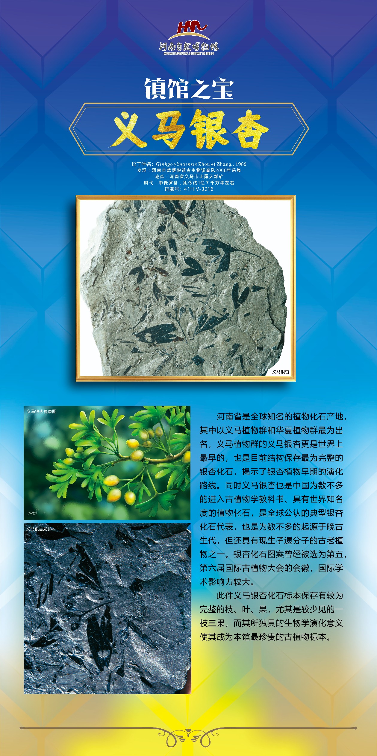 义马银杏:是全球公认的典型银杏化石代表,是河南最有影响力的古植物化石,该标本保存结构最为完整。