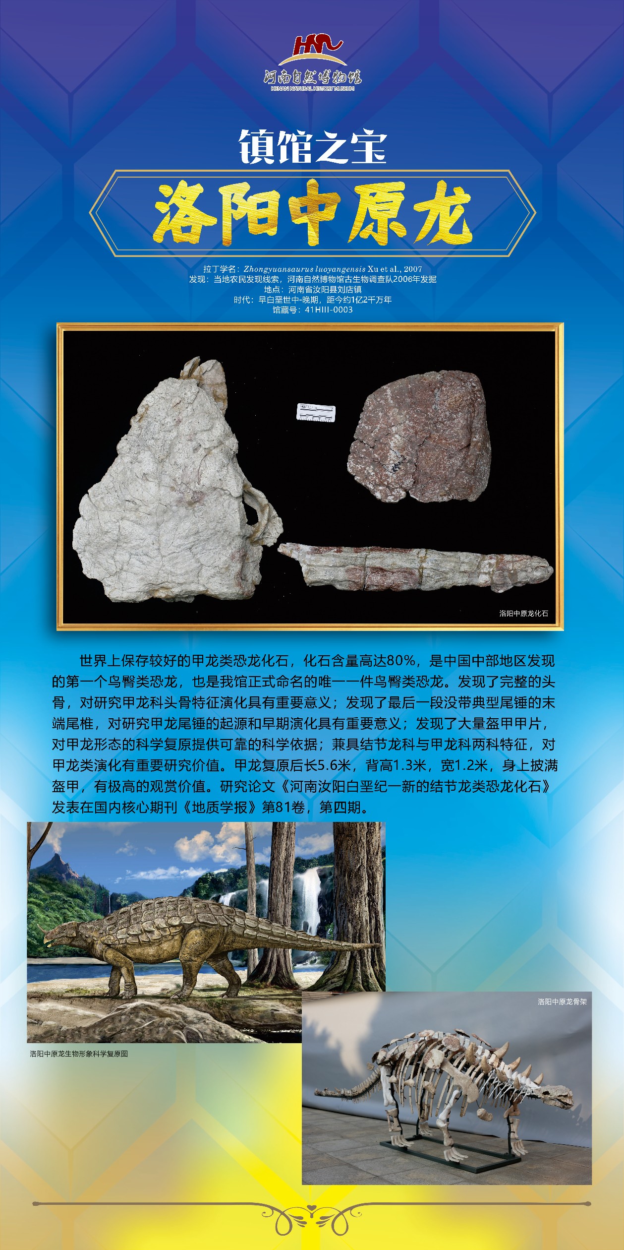 洛阳中原龙:中国中部地区发现的第一个鸟臀类恐龙,也是河南自然博物馆正式命名的唯一一件鸟臀类恐龙;也是迄今为止发现的第一个具有确凿证据的结节龙类甲龙。