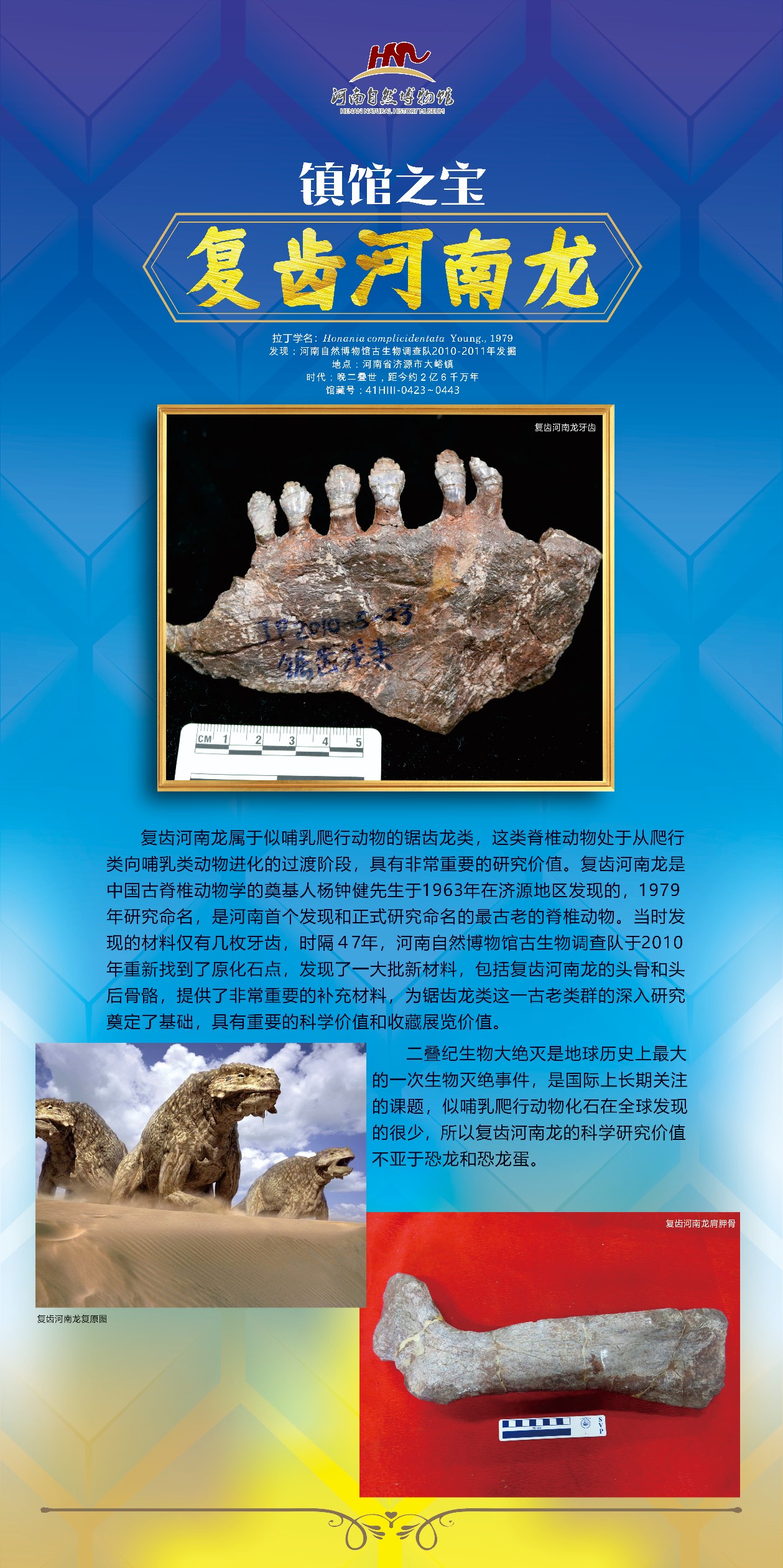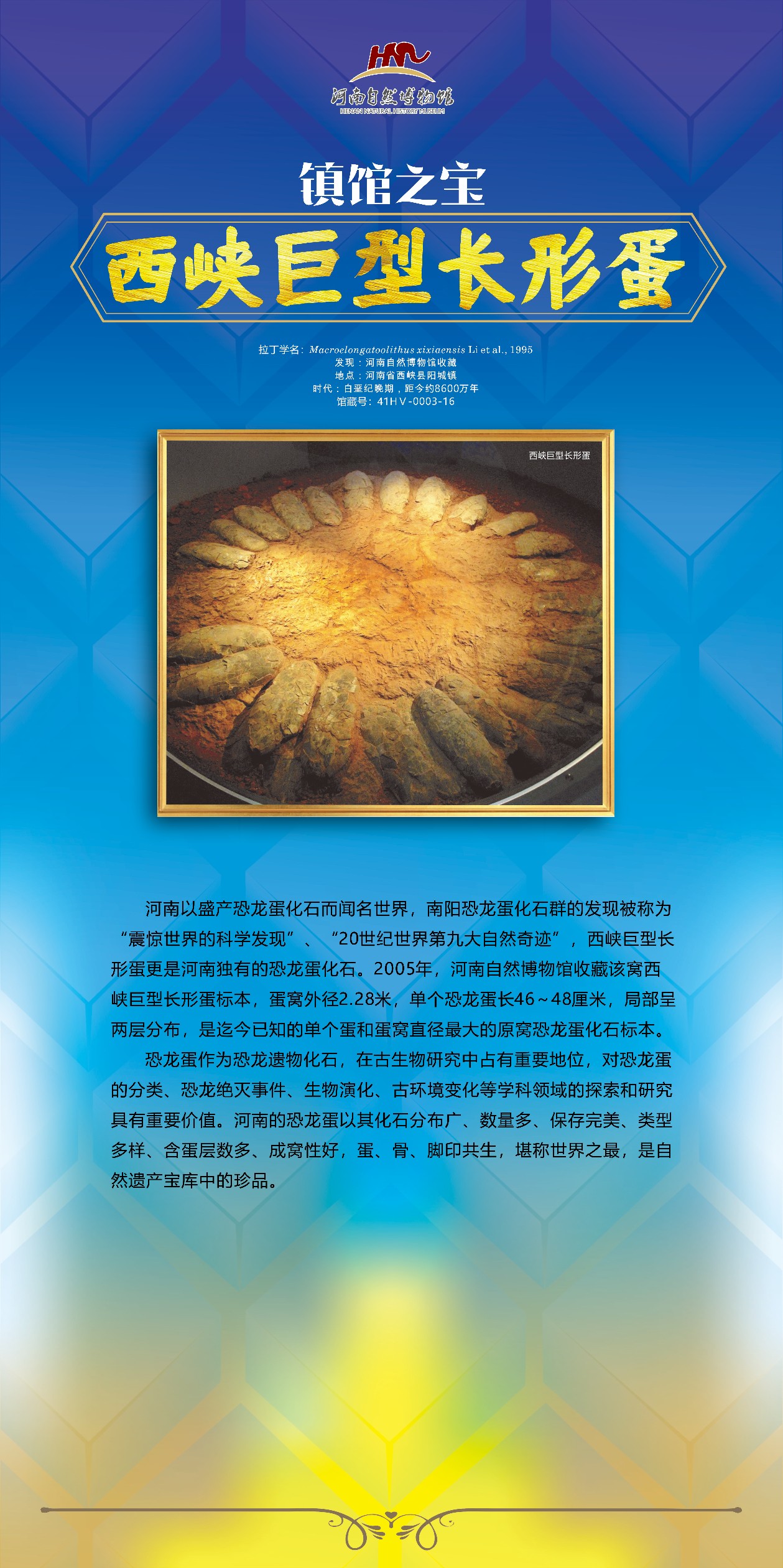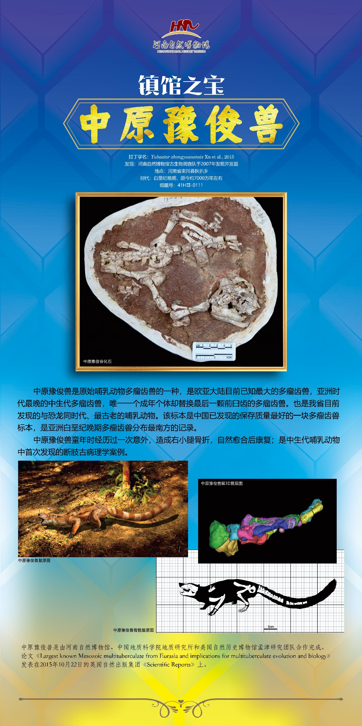 这些化石标本都是河南自然博物馆自主发掘、采集、修理、复原,联合国内外知名学者研究的,论文大多发表在国内外SCI 检索期刊和在国际学术交流会上交流,成果获得过省部级多项奖励,出版有专著,在中央电视台等国内外知名媒体上出品过科普专题片,还拍摄发行有一部4D电影《恐龙王国》。
