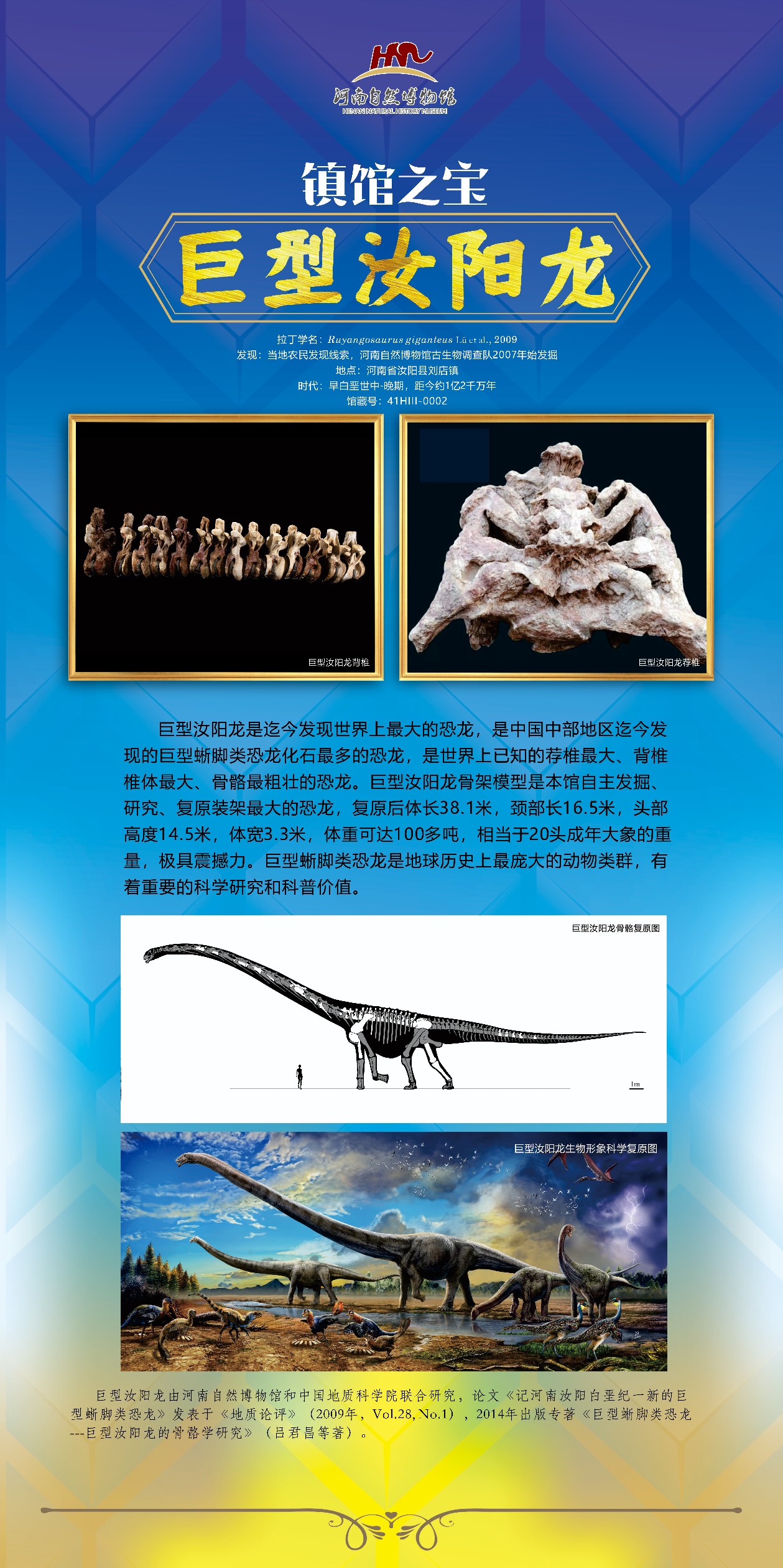 巨型汝阳龙:迄今发现的世界上最大的恐龙,荐椎最大、背椎椎体最大、骨骼最粗壮,是河南自然博物馆自主发掘、研究、复原装架最大的恐龙。