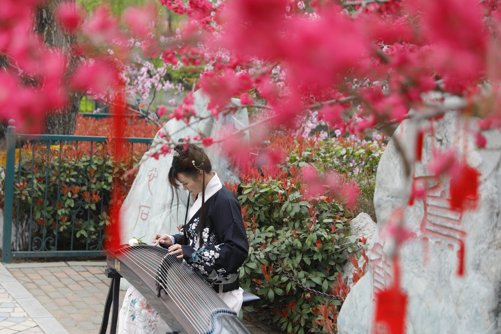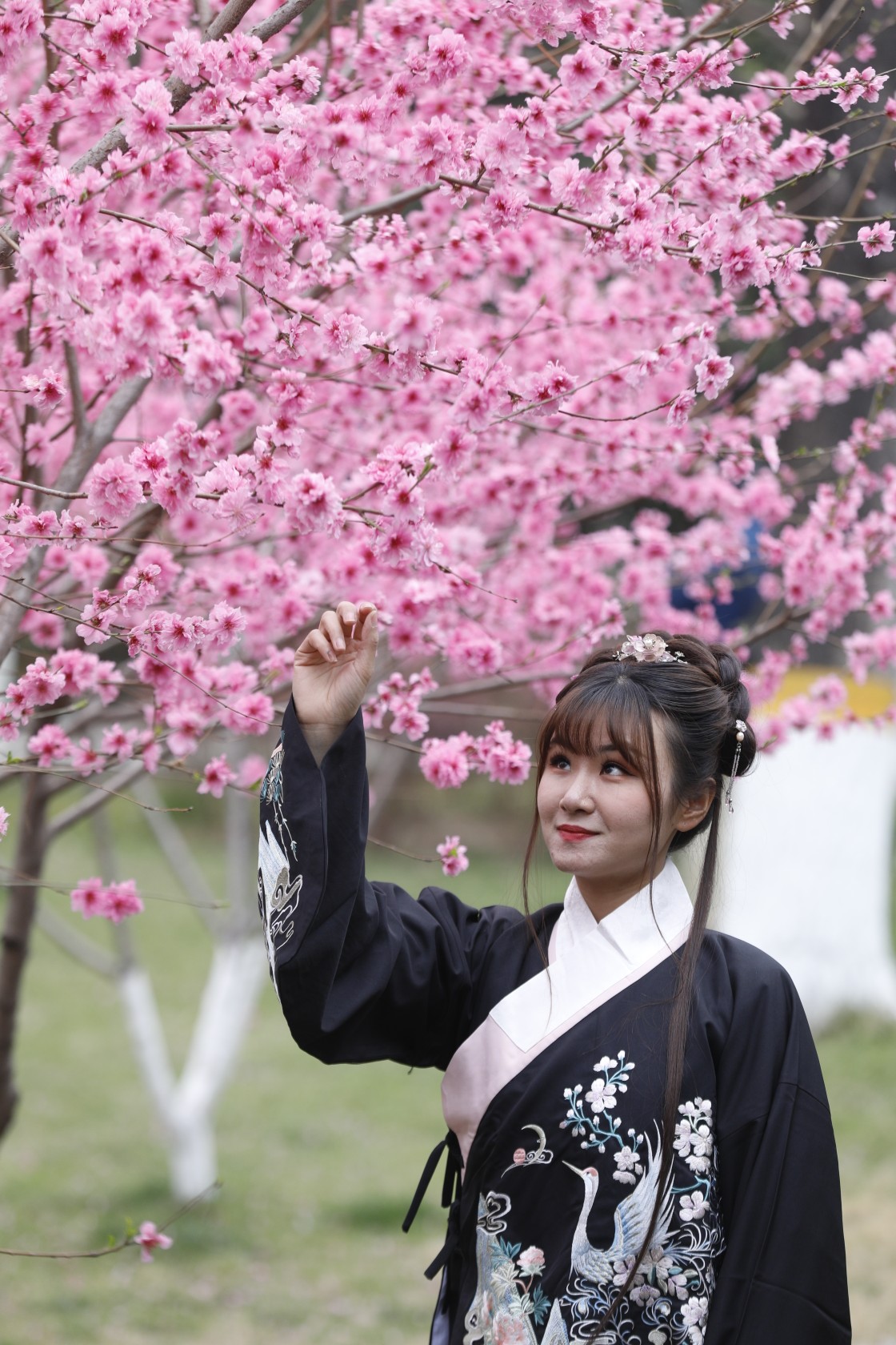 身穿汉服的游客和桃花合影。3月19日至3月26日,凡是身穿汉服的游客都可以免票入园游玩