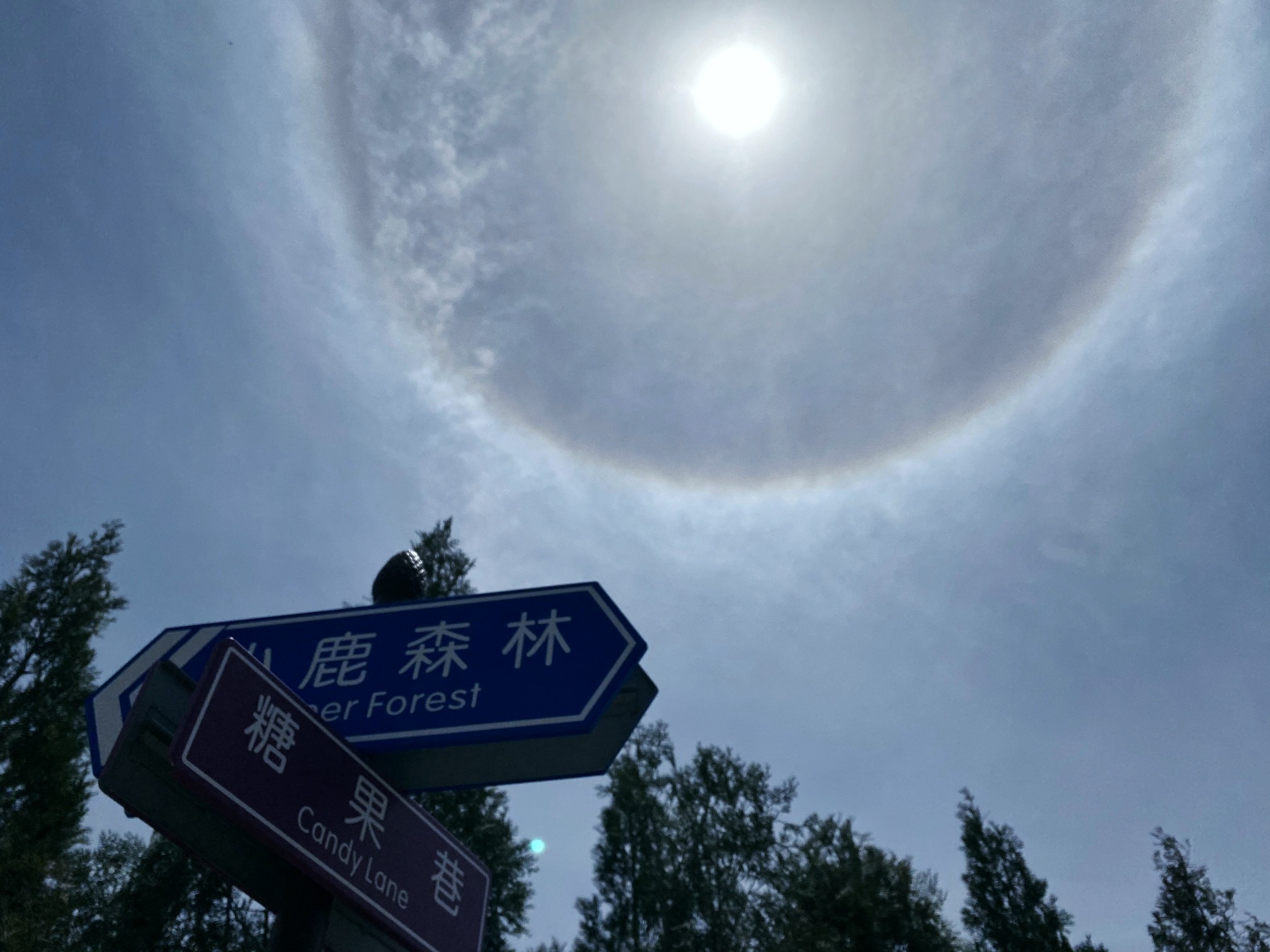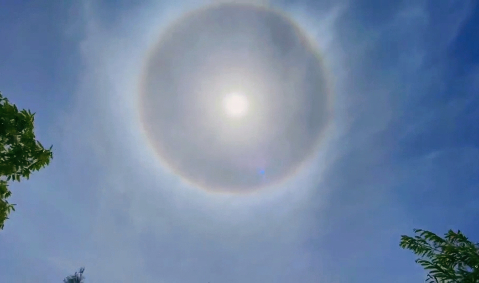 其实,当高空存在由冰晶组成的薄云(卷云或卷层云)时,日、月光通过云中冰晶折射或反射后,会在日、月周围出现一些以日、月为中心的彩色光环或圆弧,统称为晕。