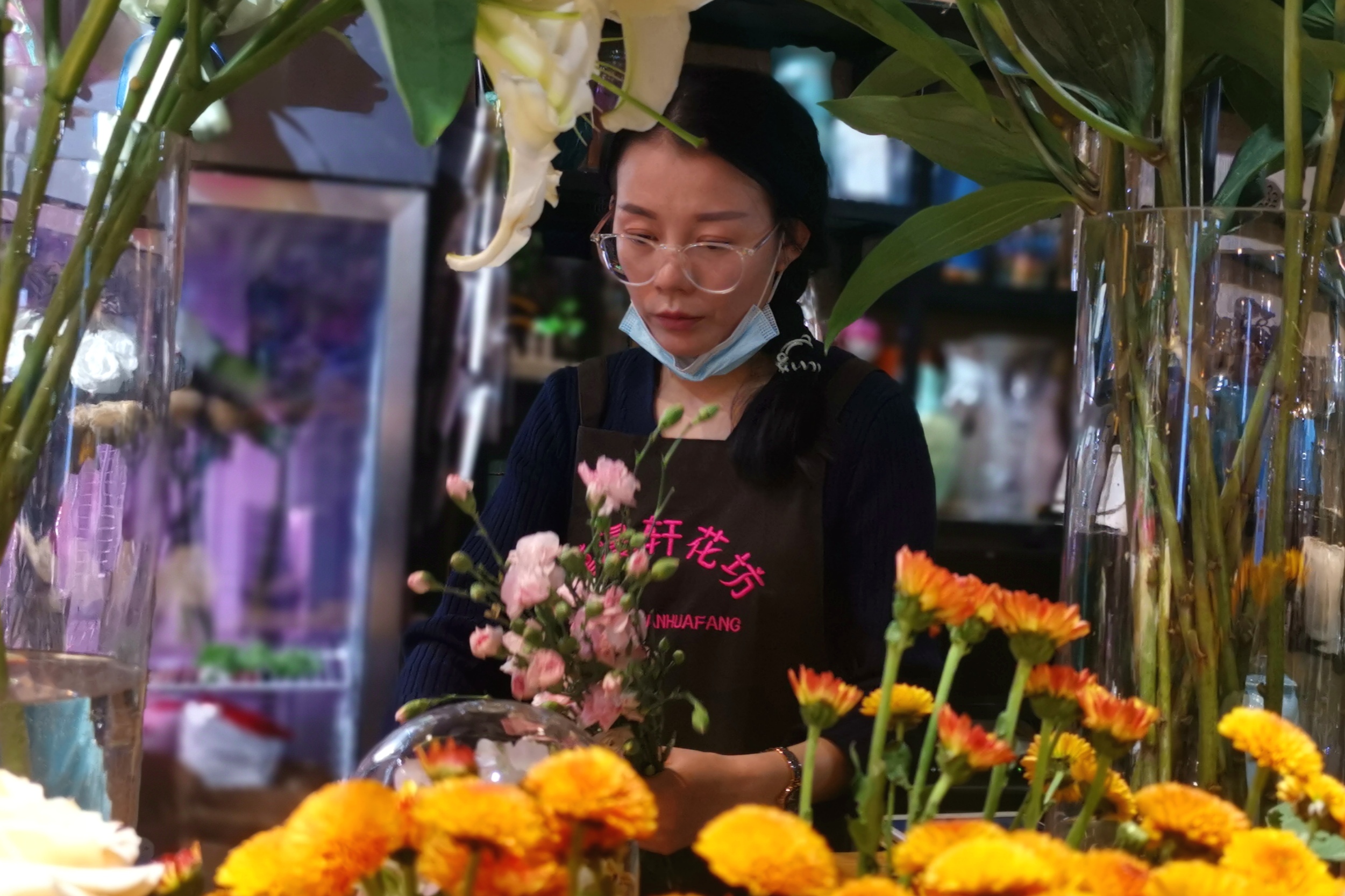 张洁现场示范、制作了一束母亲节的主推花束,包括粉色康乃馨、翠菊、水仙百合、泰迪菊,一会功夫,一束娇艳美丽的鲜花就成型了。