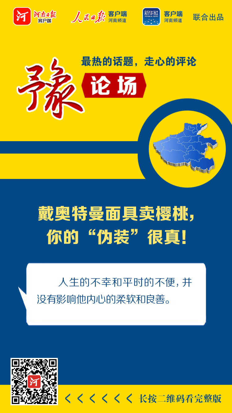 带上面具卖樱桃的细节,展现了他设身处地为他人着想的善良心地和可贵品质。自己烧伤留下疤痕,人生的不幸和平时的不便,并没有影响他内心的柔软和良善,而是设身处地地为他人着想,生怕自己的疤痕给人带来观感上的不适。这份同理心和共情心,难能可贵。