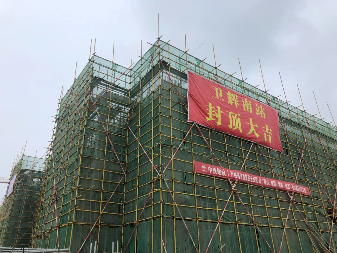 5月10日,卫辉南站站房主体结构封顶。