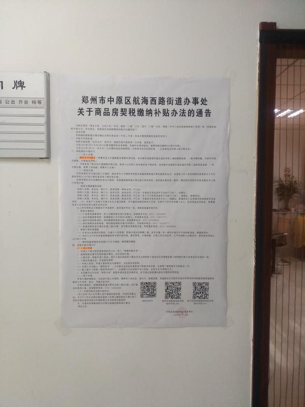 网上流传的照片显示,郑州航海西路办事处发布了一份《郑州市中原区航海西路街道办事处关于商品房契税缴纳补贴办法的通知》(下简称《通知》)。