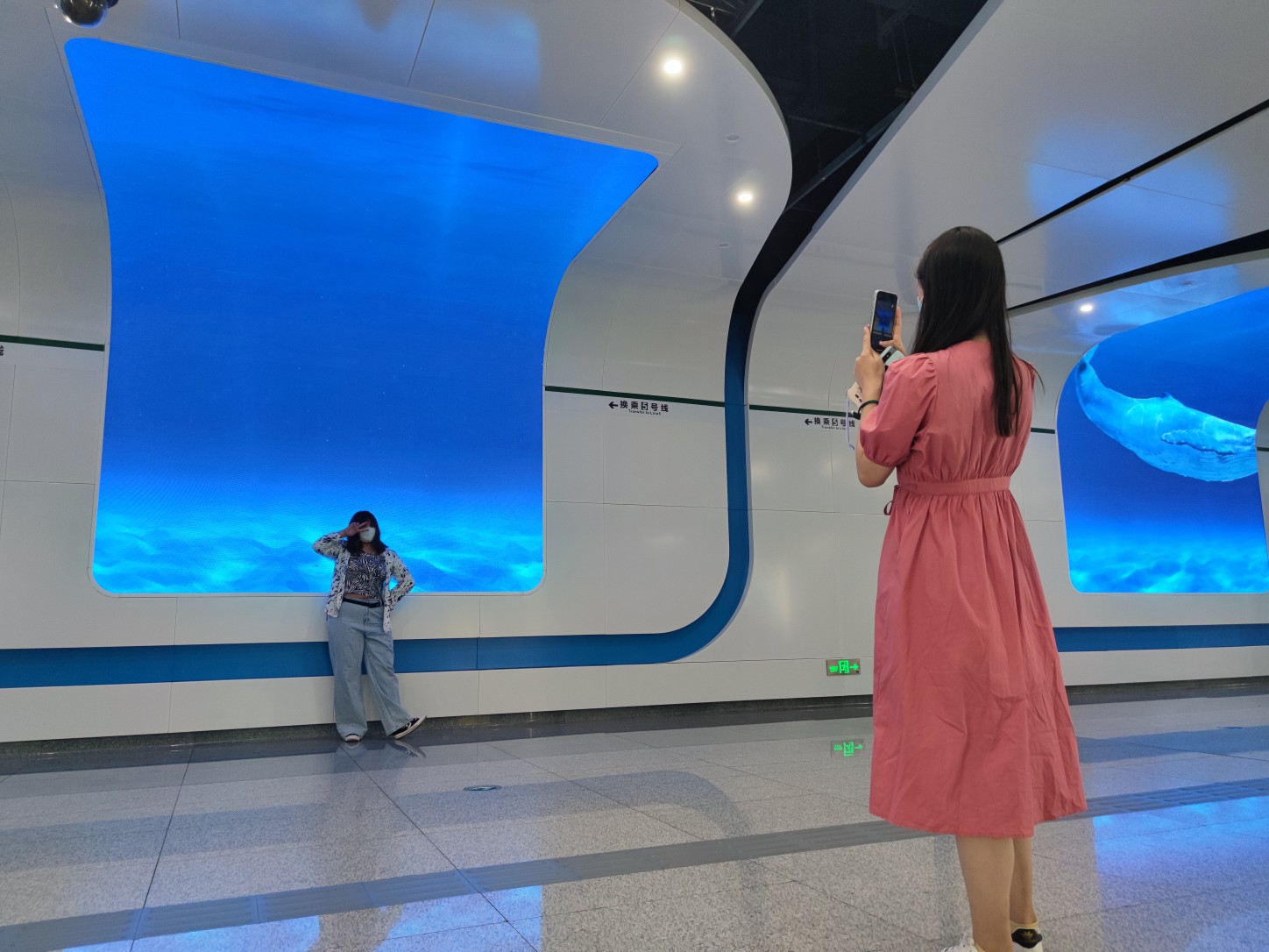 近日,郑州地铁4号线七里河站内三块大屏幕上播放的海洋画面火爆网络,一时间成为众多网友的打卡胜地。