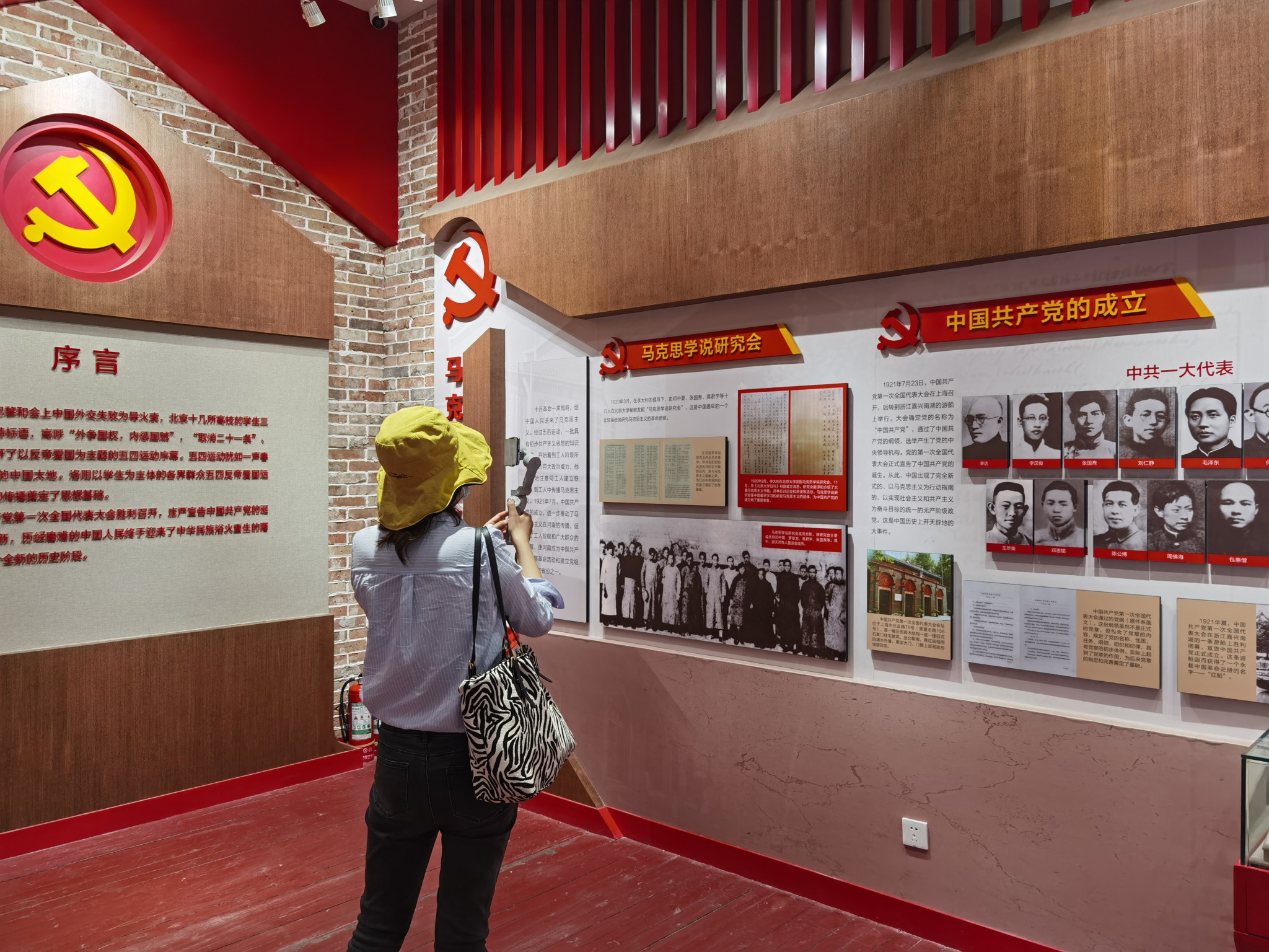 “我们现在看到的是游天洋、白眉珊、王福顺三人入党宣誓的场景。其中站在最前面这位就是游天洋,在他身后的两位分别是白眉珊和王福顺。他们紧握拳头、昂首挺胸,面向党旗发出庄严的宣誓,志愿加入中国共产党!中共洛阳组就在这坚毅而厚重的宣誓声中诞生了。”东侧展厅内,张海燕向记者介绍道。