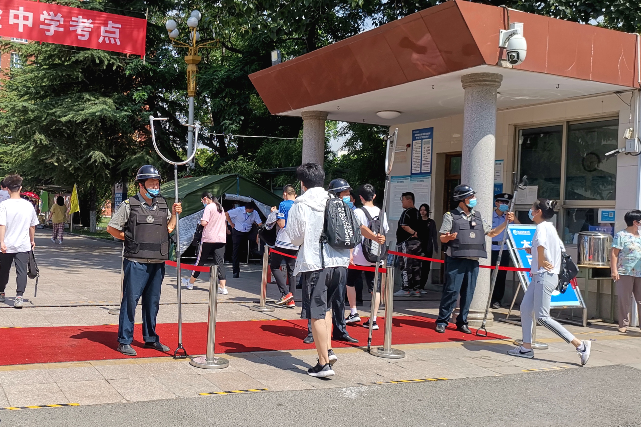 上午9时,在河南省实验中学考点,考生进场完毕,助考工作人员张珺的衣服已经汗湿了好几遍,看看手机的实时气温,已经超过了30℃。
