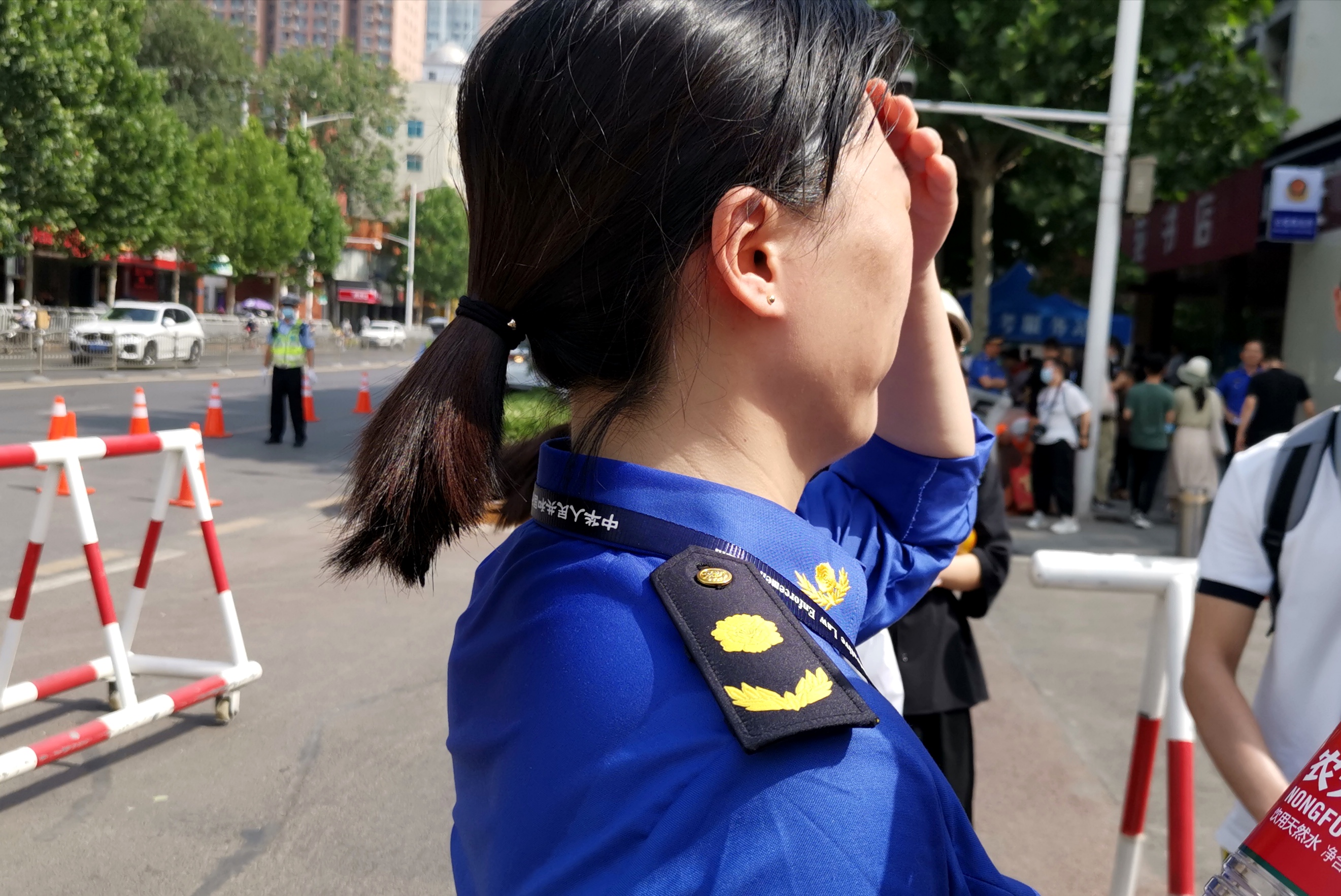 “每年的高考几乎都是在炎热的天气下进行的,我们作为志愿者想的是在这样的天气下能够做一些自己力所能及的事情,为考生保驾护航。”黄菲告诉记者,她早上6点半就到达考点,帮助做一些交通疏导、发放口罩和降暑的药物等工作,中午也是匆匆吃完饭就过来等候在考点外。