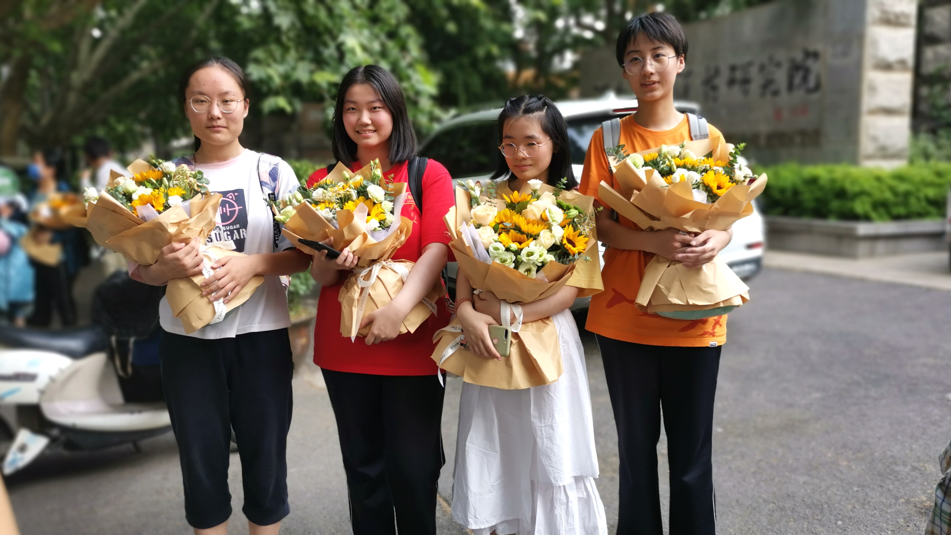“我们一起收到了鲜花,特别开心。”在考点外,4名刚结束考试的考生正抱着相同的鲜花合影。