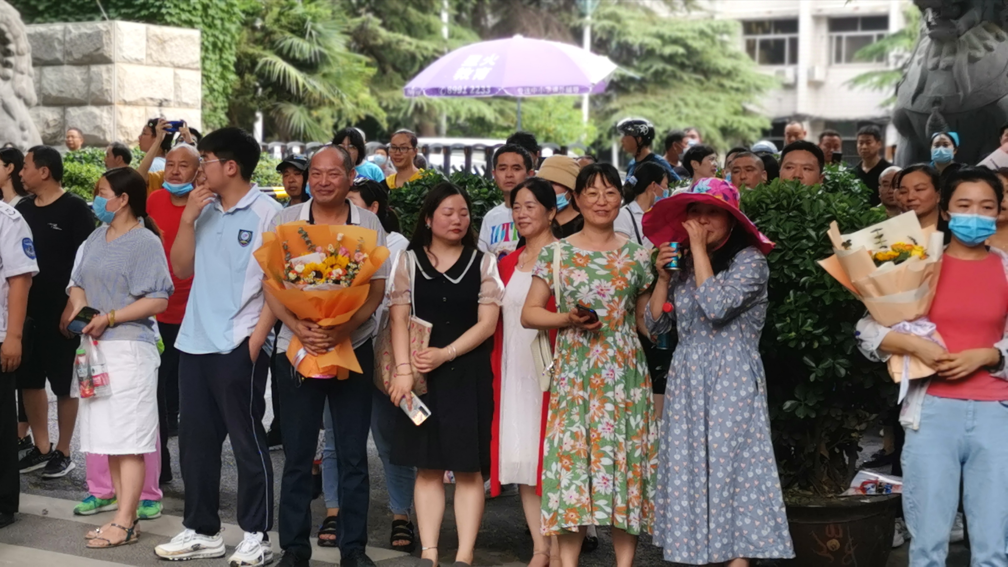“考试结束了”“马上出来了”......6月8日17时,最后一门考试结束铃声响起,等候在考点外的人群随之兴奋起来,不少家长手捧鲜花翘首以盼,准备在孩子走出考场第一时间送上祝福。
