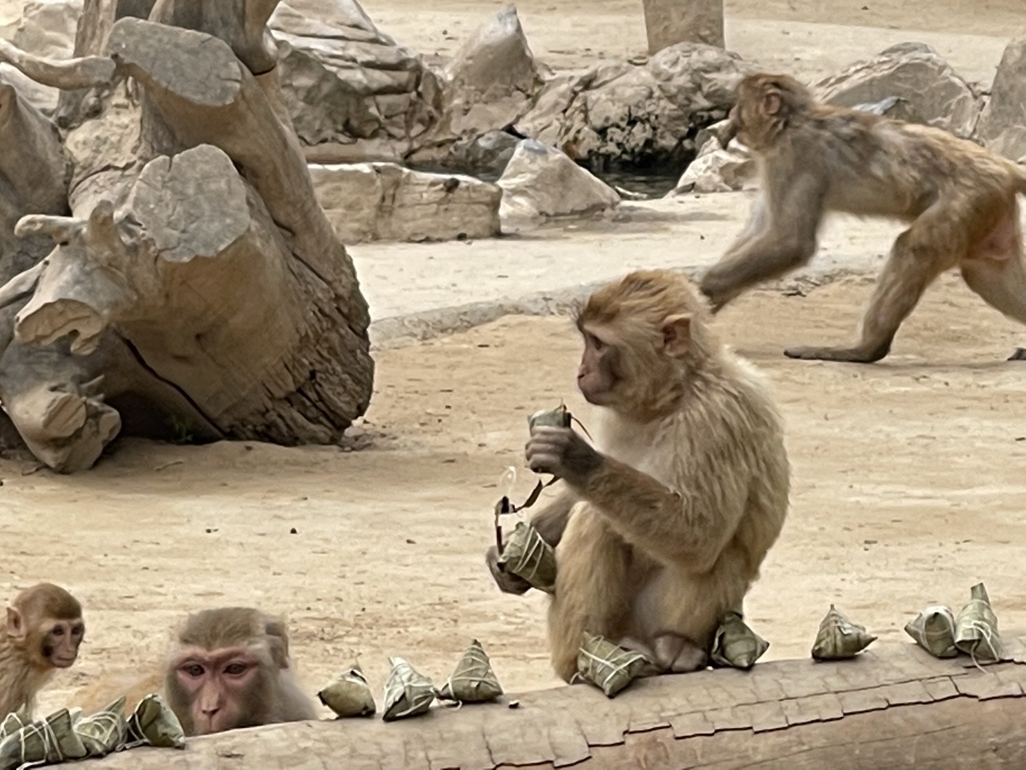 大猩猩尼寇和黑猩猩菲莉的水果粽里有它们喜欢的西瓜、葡萄、香蕉、苹果,也有粗纤维的树叶,口感一流又营养健康。猕猴们也“大饱口福”,不光能吃到加了红枣葡萄干、馅料丰富的水果粽,还可以享用新鲜出炉的糯米粽,软糯香甜,爱心满满。