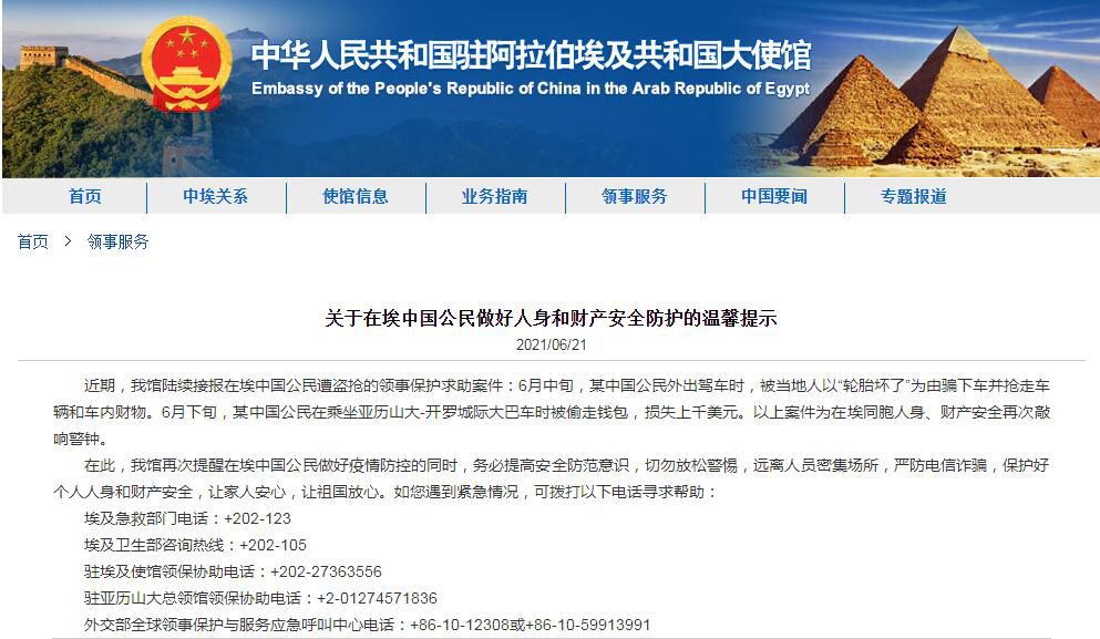 近期,我馆陆续接报在埃中国公民遭盗抢的领事保护求助案件:6月中旬,某中国公民外出驾车时,被当地人以“轮胎坏了”为由骗下车并抢走车辆和车内财物。6月下旬,某中国公民在乘坐亚历山大-开罗城际大巴车时被偷走钱包,损失上千美元。以上案件为在埃同胞人身、财产安全再次敲响警钟。
