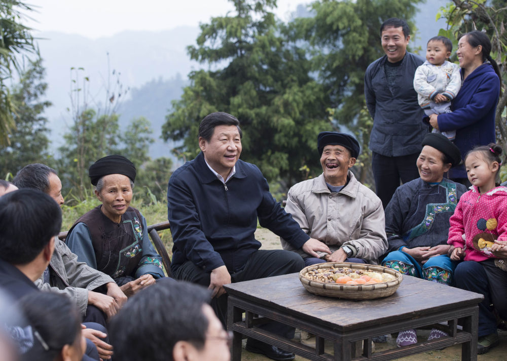 ↑2013年11月3日,习近平在湖南湘西土家族苗族自治州花垣县排碧乡十八洞村同村干部和村民座谈。