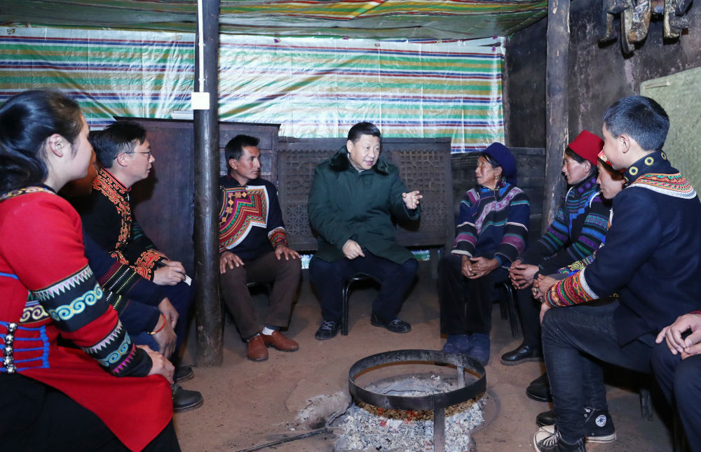 ↑2018年2月11日,习近平在四川凉山彝族自治州昭觉县三岔河乡三河村节列俄阿木家中同村民代表、驻村扶贫工作队员围坐火塘边,共谋精准脱贫之策。