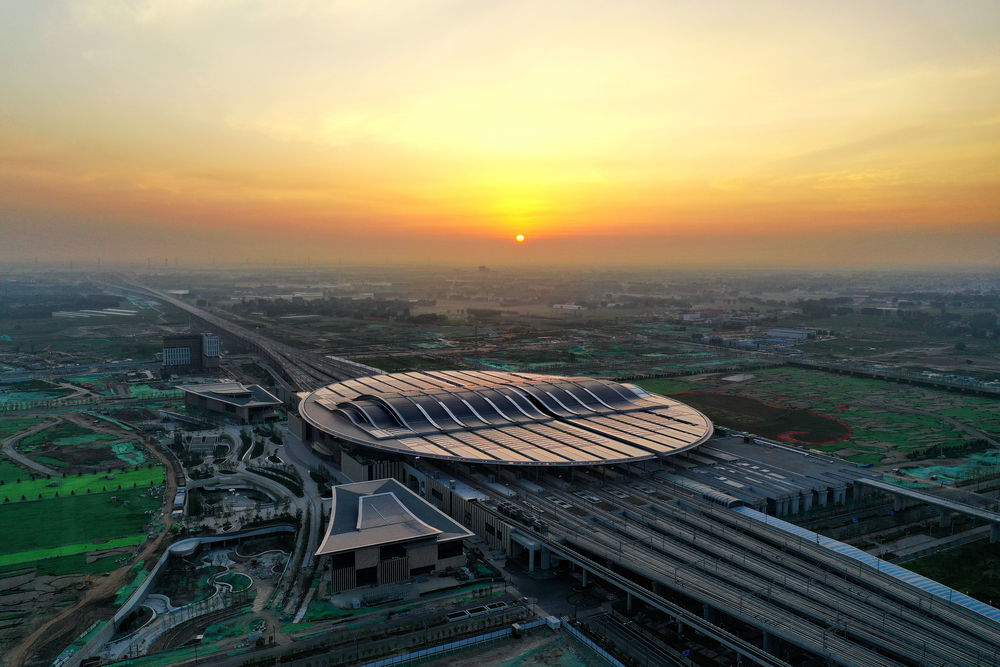 ↑2021年7月1日在河北雄安新区京雄城际铁路雄安站拍摄的日出(无人机照片)。