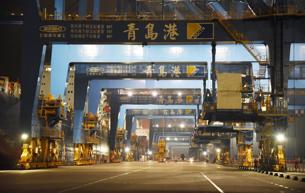 ↑2021年7月1日凌晨拍摄的山东港口青岛港全自动化集装箱码头。