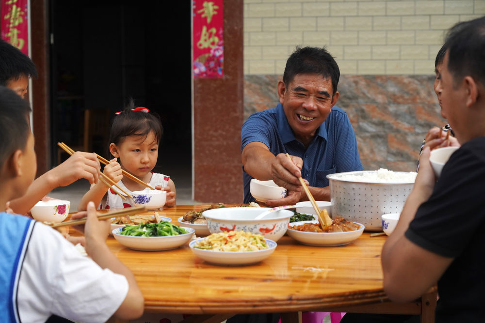 ↑2021年7月1日,江西省瑞金市叶坪镇禾仓村村民曾得涛(中)和家人一起吃早饭。