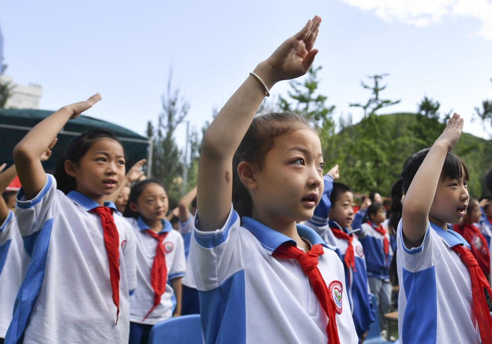 ↑2021年7月1日,在陕西延安杨家岭福州希望小学,学生在收看庆祝中国共产党成立100周年大会时唱国歌。