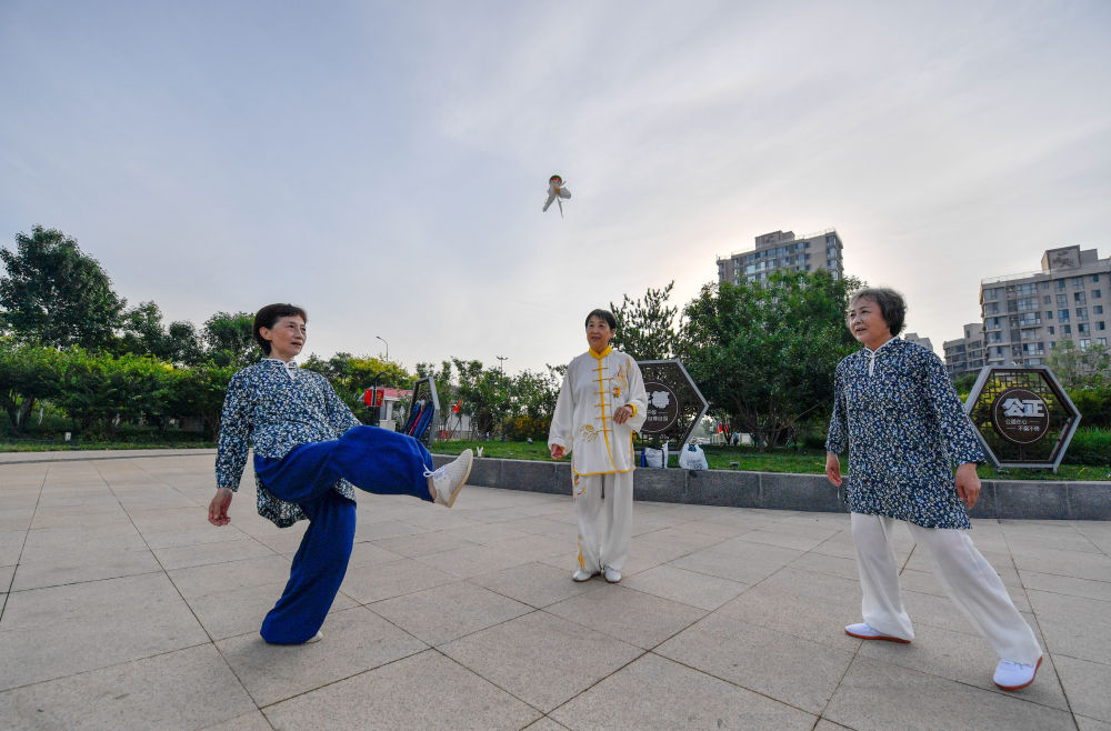 ↑2021年7月1日,市民在天津市南翠屏公园内踢毽健身。