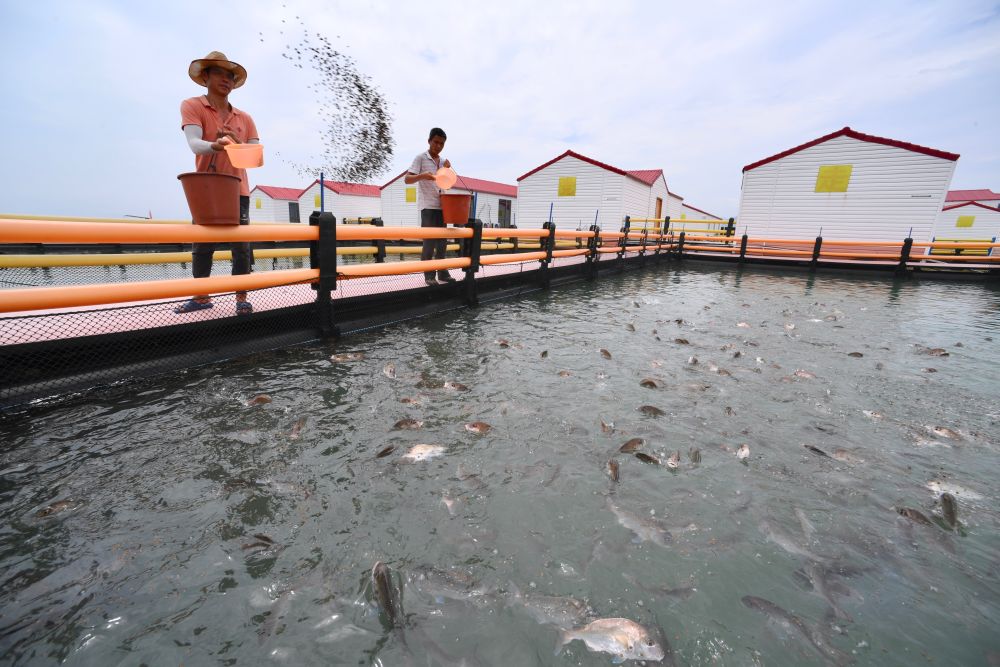↑2021年7月1日,福建省宁德市霞浦县溪南镇七星海域转型升级的深水网箱养殖区工人在喂鱼。