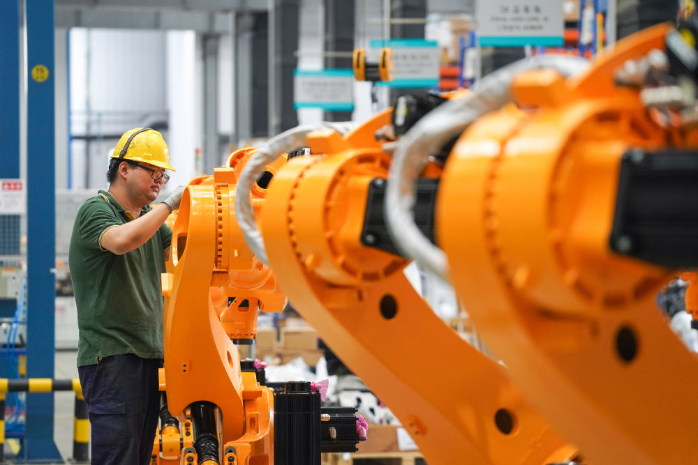 ↑2021年7月1日,在位于南京市江宁区的南京埃斯顿自动化股份有限公司工业机器人生产车间,工作人员对组装好的工业机器人进行调试。