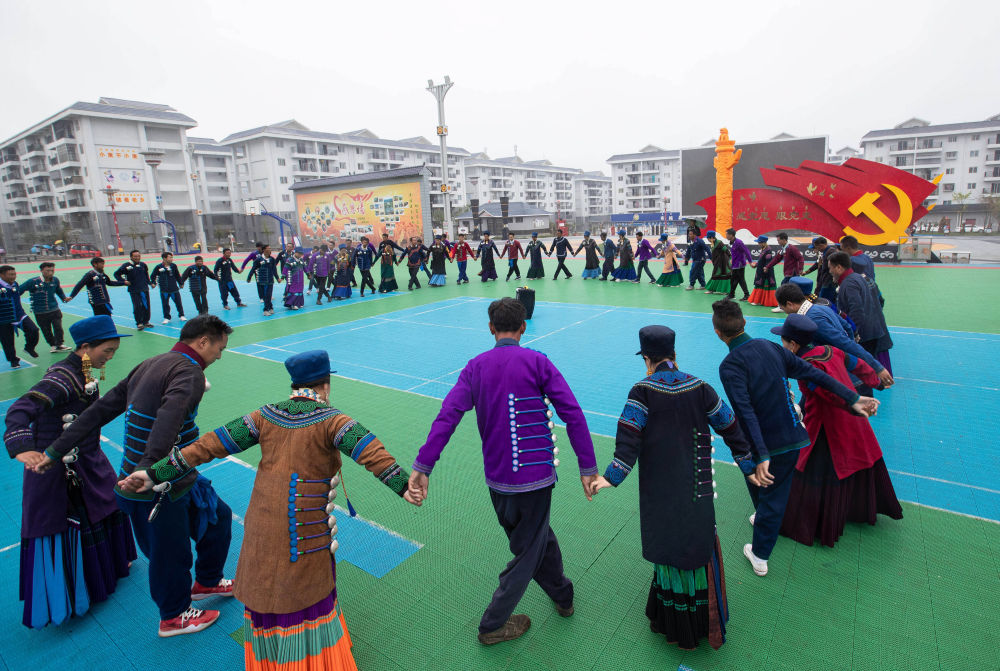 ↑2021年7月1日,在四川省布拖县易地扶贫搬迁县城集中安置点(依撒社区),彝族群众在广场上跳彝族达体舞。