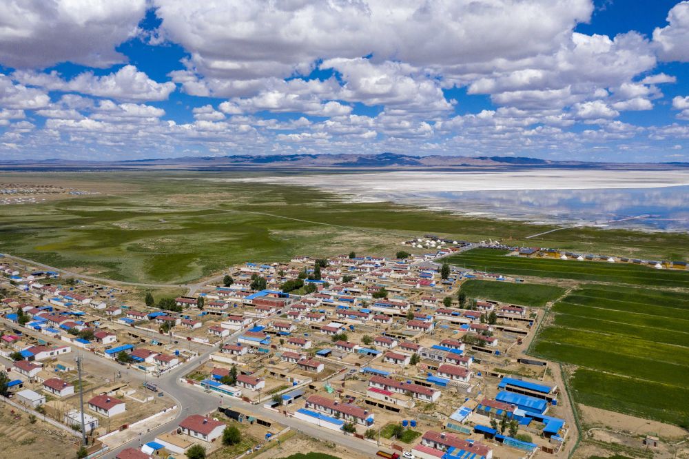 ↑2021年7月1日拍摄的新疆巴里坤哈萨克自治县海子沿乡尖山子村(无人机照片)。