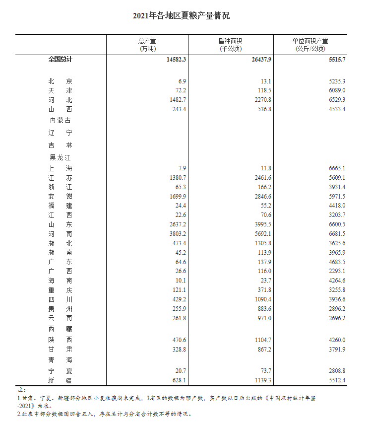 · 2021年全国夏粮总产量14582万吨,河南3803.2万吨居全国第一