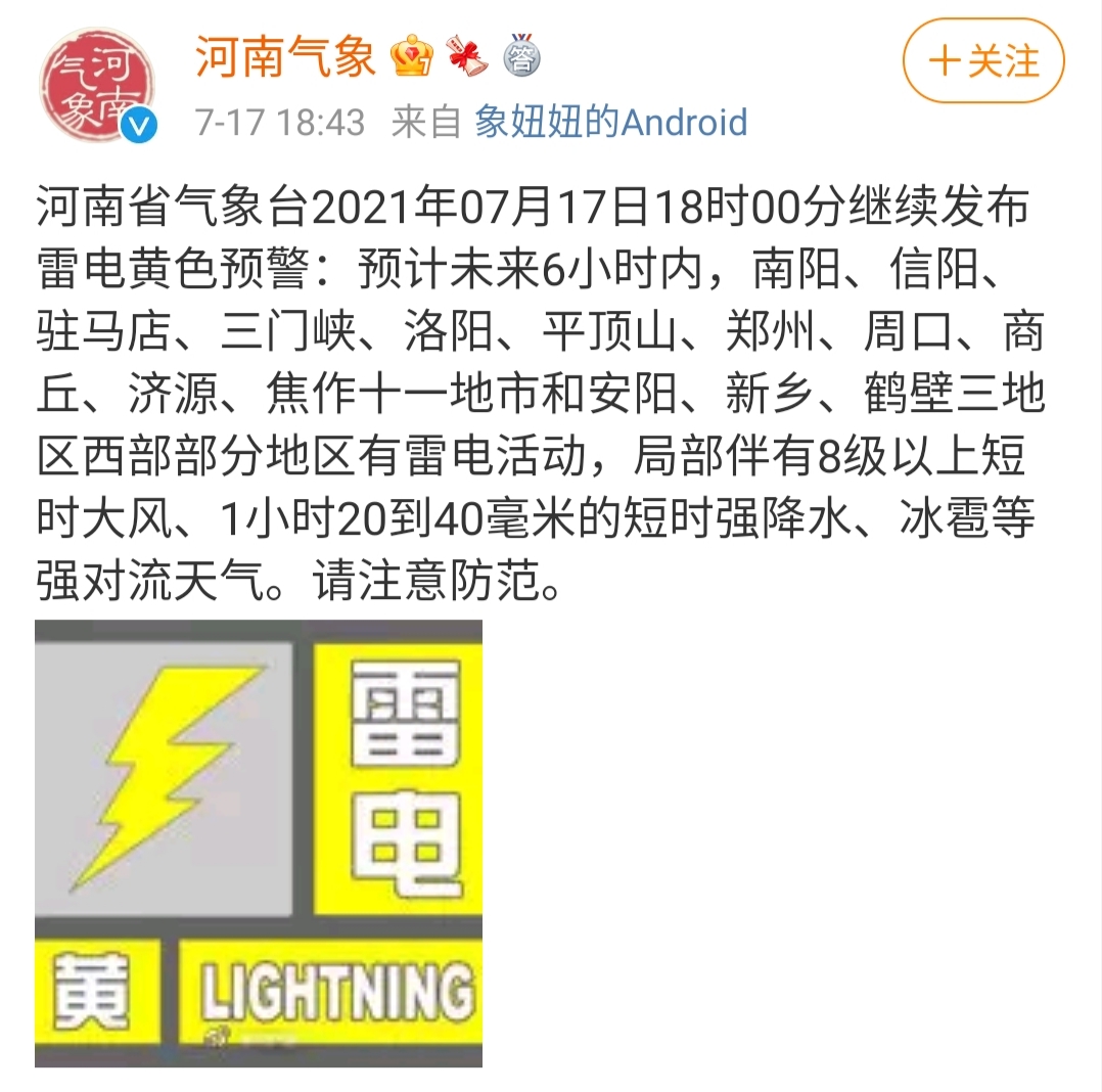 地质灾害预警预报达到黄色预警的地区为:郑州、南阳大部,安阳、鹤壁西部,济源、新乡、许昌北部,三门峡、洛阳中南部及东部,平顶山周边,信阳南部及西北部局部,驻马店南部局部,焦作中部局部,巩义中南部,汝州北部,固始南部,发生地质灾害的可能性较大。