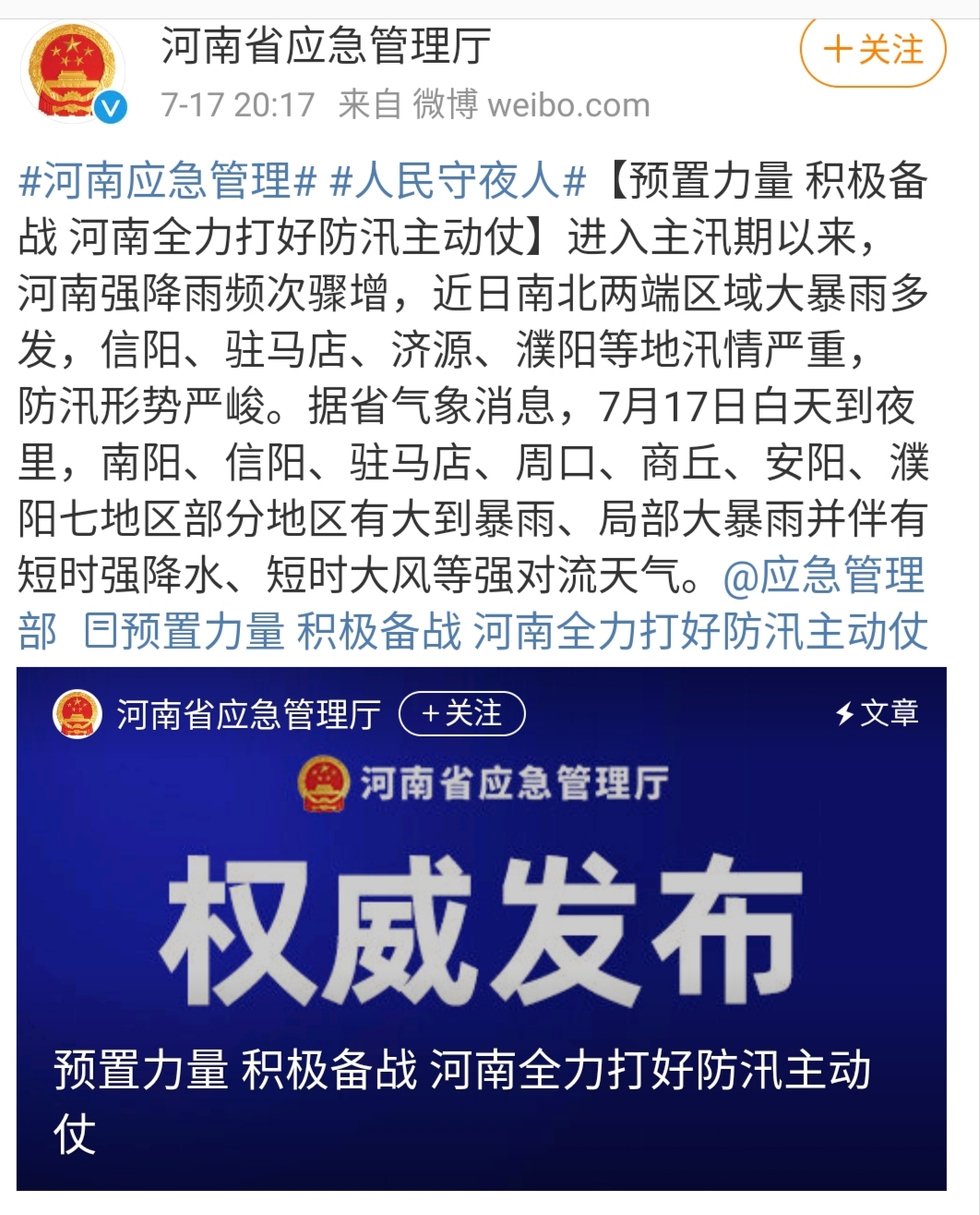 据媒体采访,7月17日,河南省水利厅下发通知,要求以战时状态做好强降雨防范工作,确保不发生溃坝、决堤以及小流域洪灾、地质灾害等造成群死群伤事故,保证防汛安全。