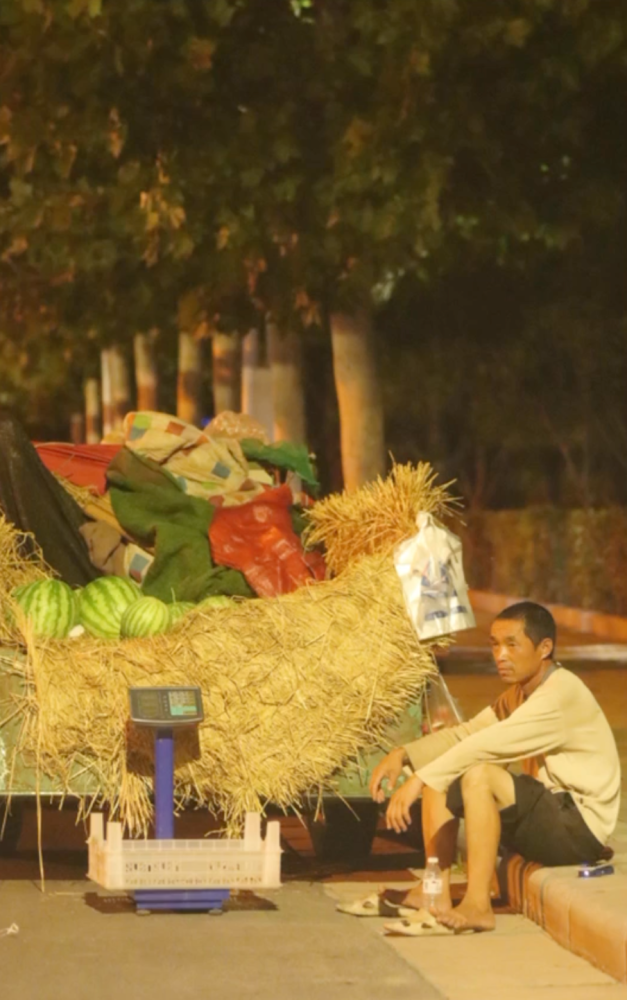 视频拍摄者被这一幕触动上前买瓜并与他攀谈起来