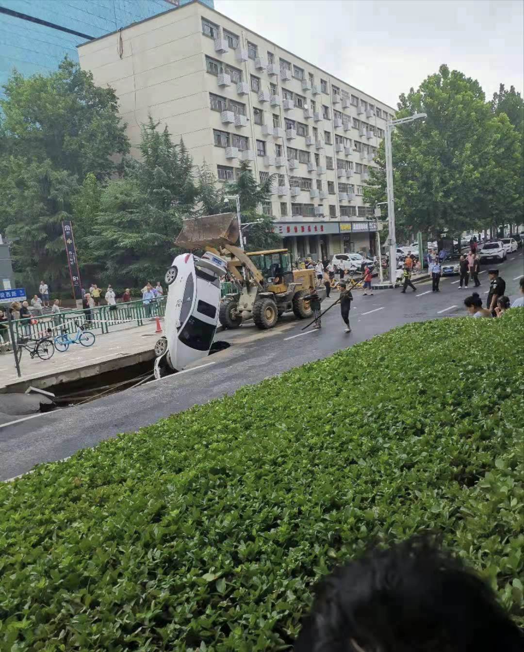只见有一处一辆汽车已经落入塌方坑内,这时又一地方开始塌方,整个路面开始下降,突然一声巨响,出现第三处塌方,随后有很大的水流喷涌而出。