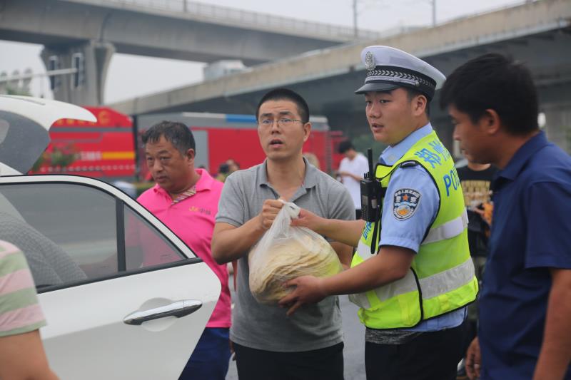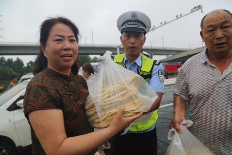 大河网讯 (记者 宋向乐)7月23日上午,郑州市公安局交警六大队民警在东四环与金水东路交叉口拖移在快车道上停放的机动车时,市民群众送来了连夜烙的数十个大饼慰问交警及抢险救灾人员。