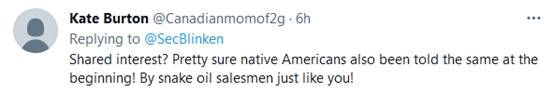 还有网友说,“共同的利益?非常肯定的是,美国土著居民在一开始被告知了同样的(话)!就是被像你一样的无耻的政客告知的。”