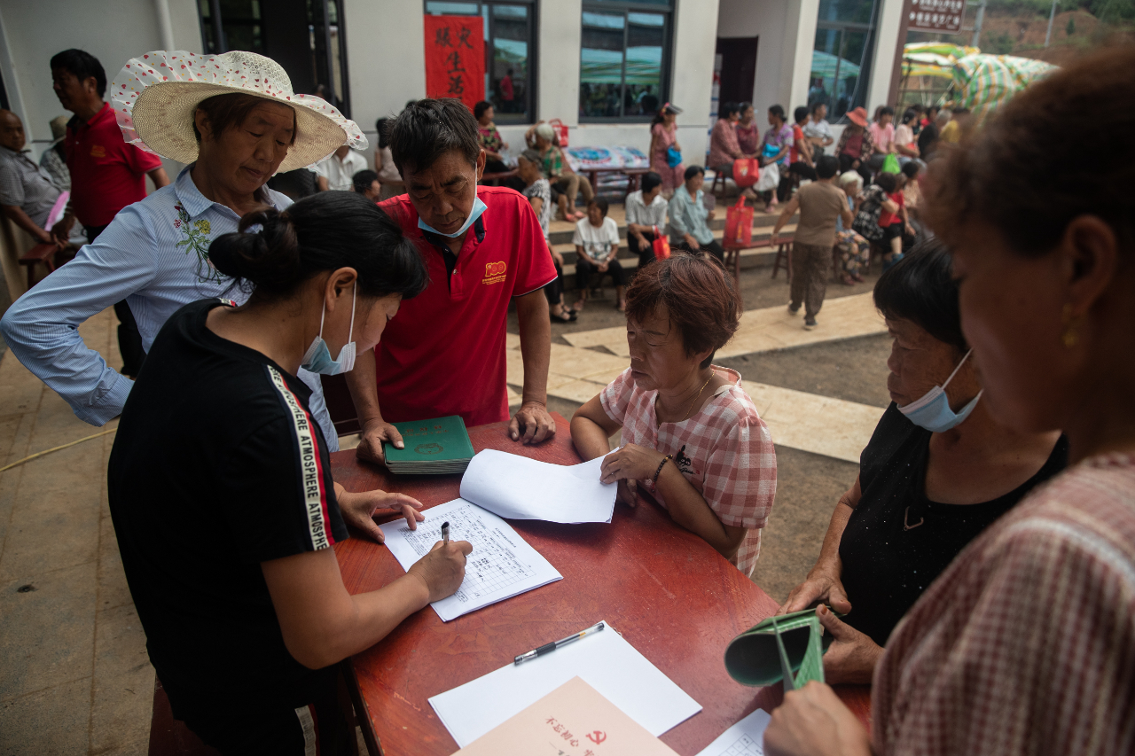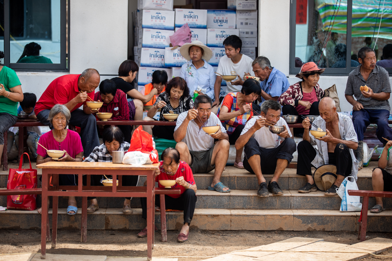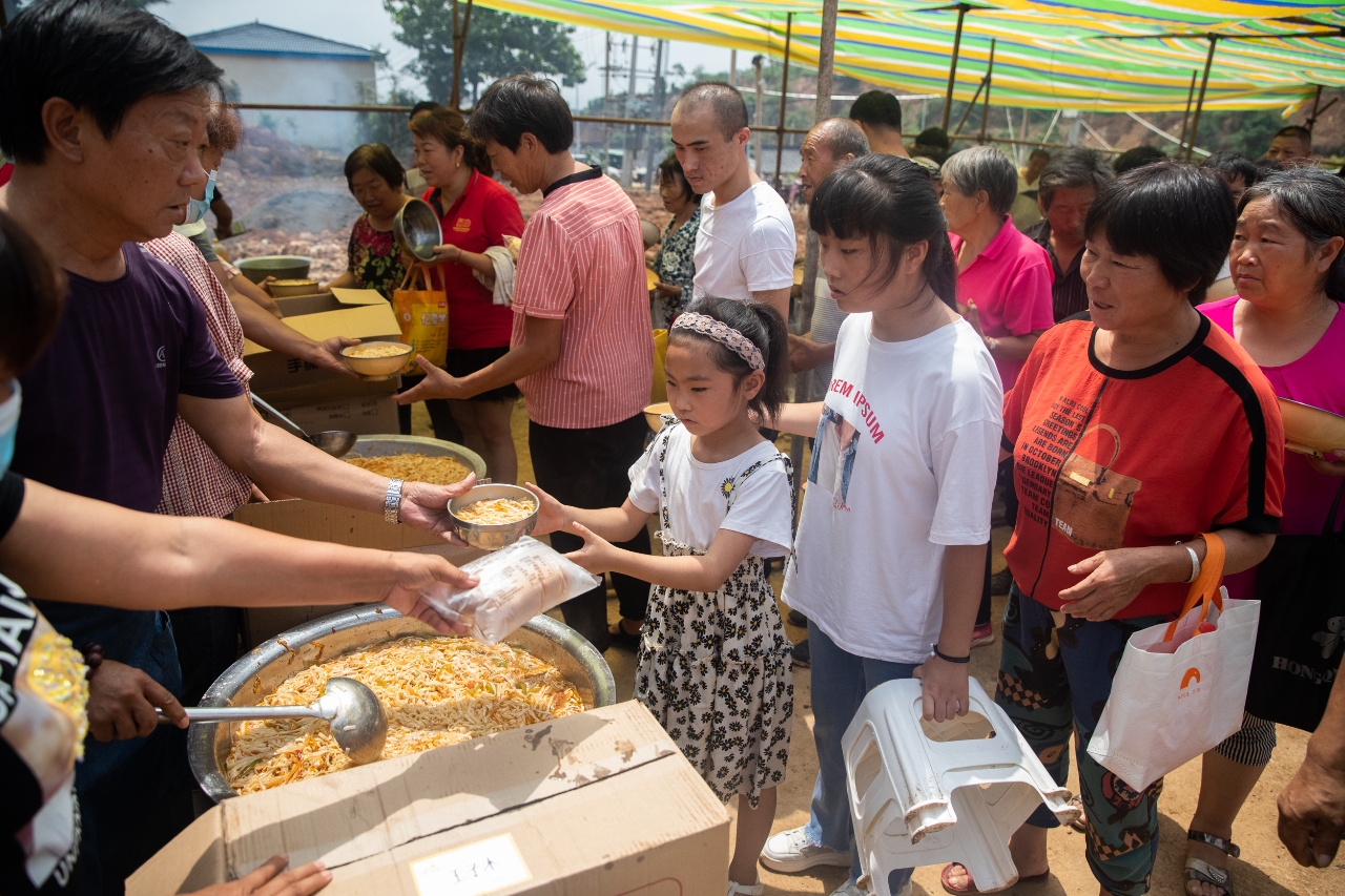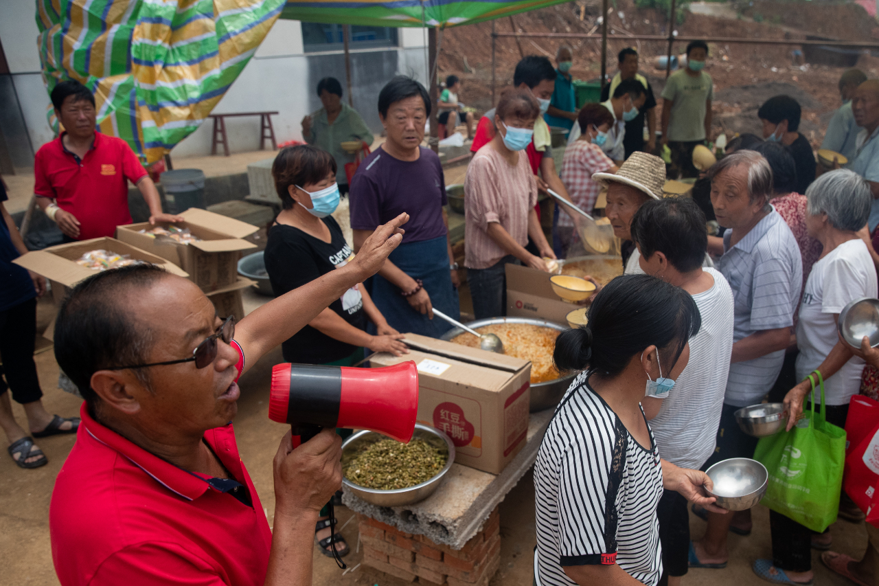 7月28日午饭时间,工作人员正在引导村民就餐。