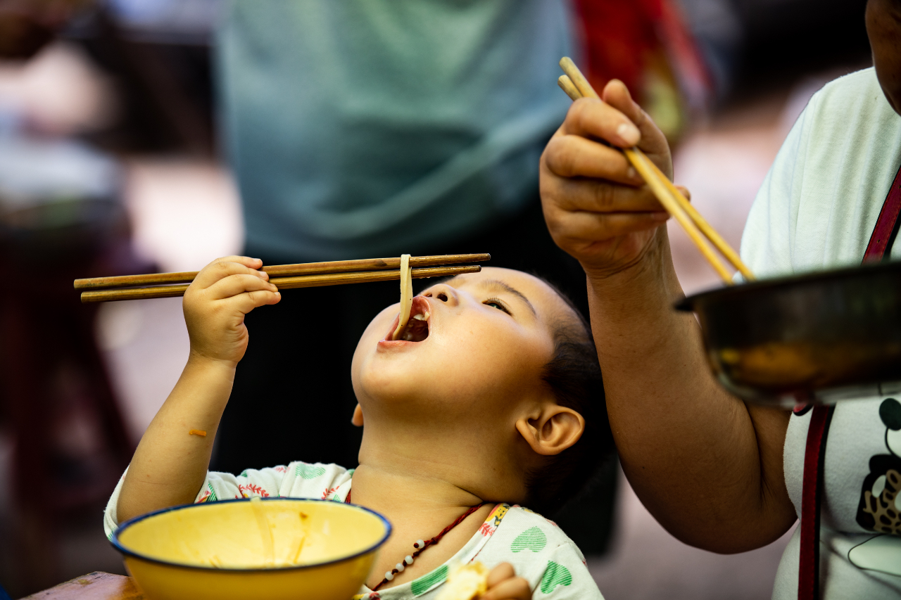 一名小朋友正在桌子前吃面条。