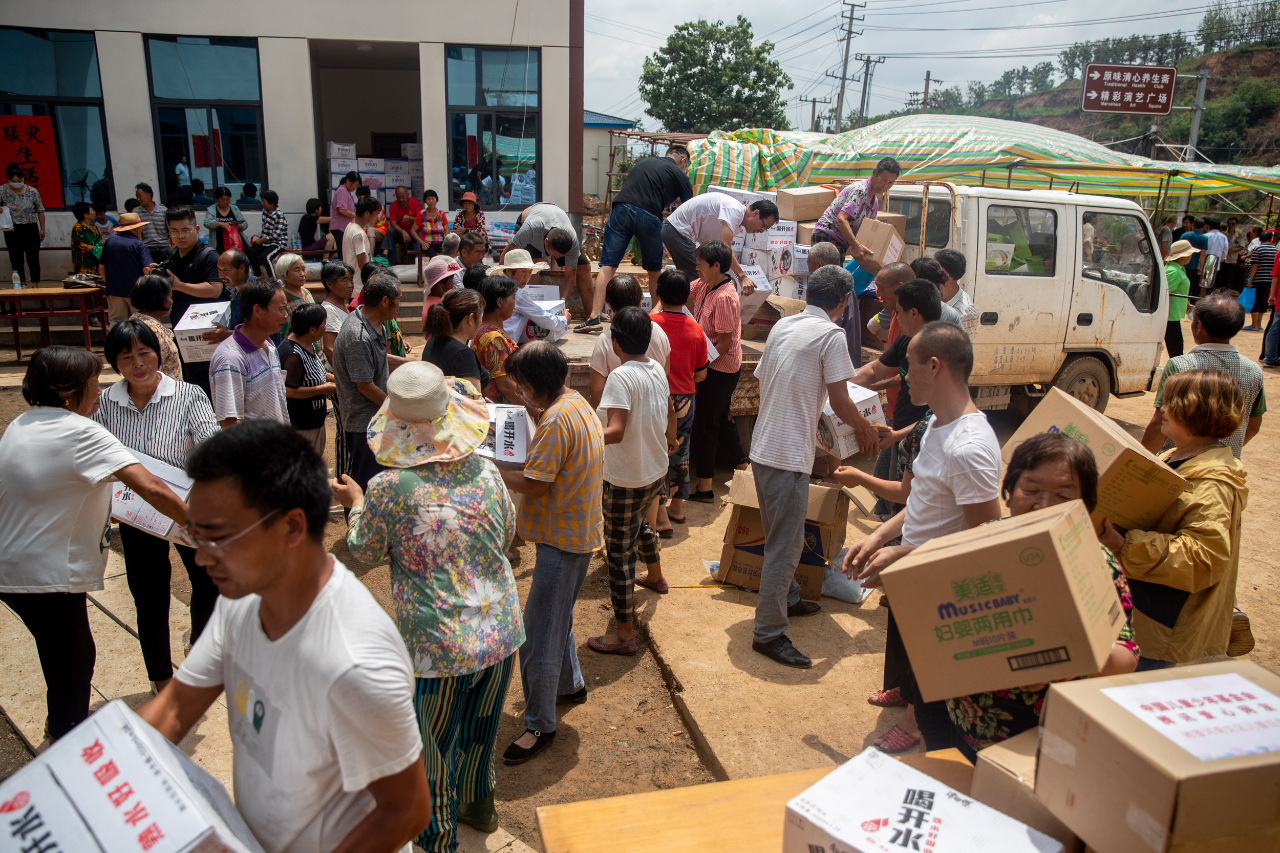 对于喝水这件事,张志伟和武新军想到一块去了。在暴雨过后的间歇,他自掏腰包连夜在市区运回来500桶纯净水放在了村部里。