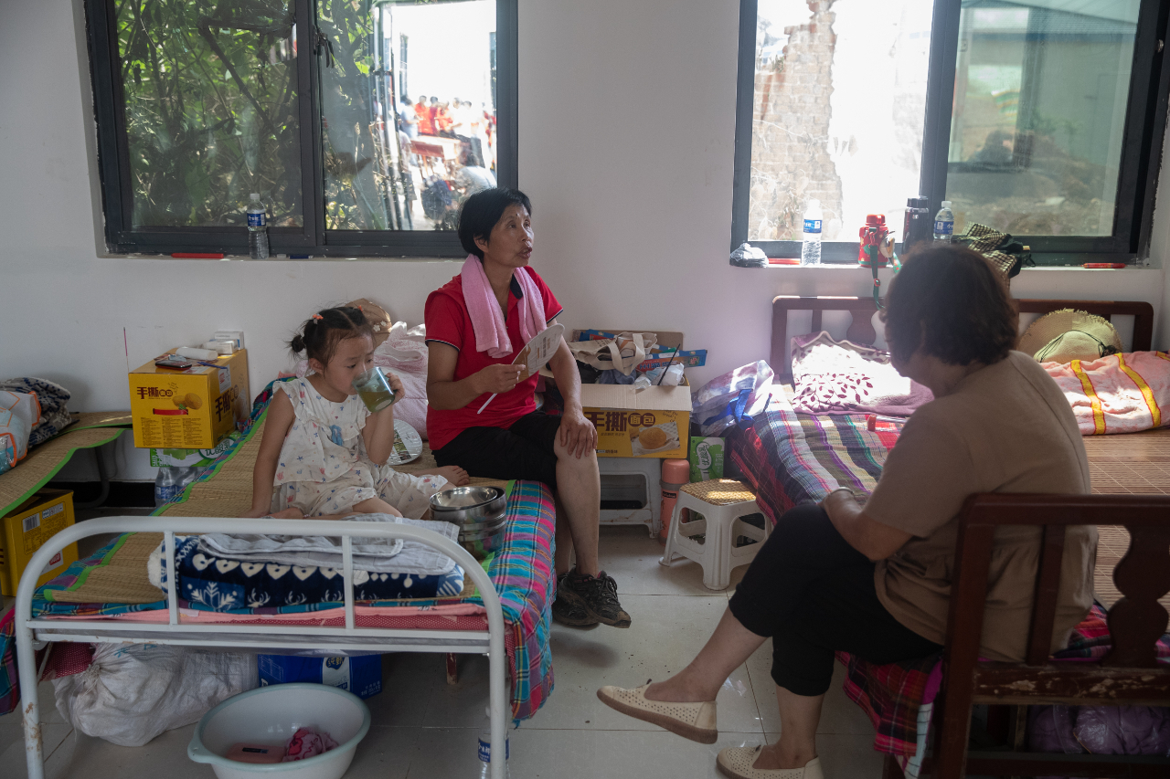村民们正在安置点内聊天。