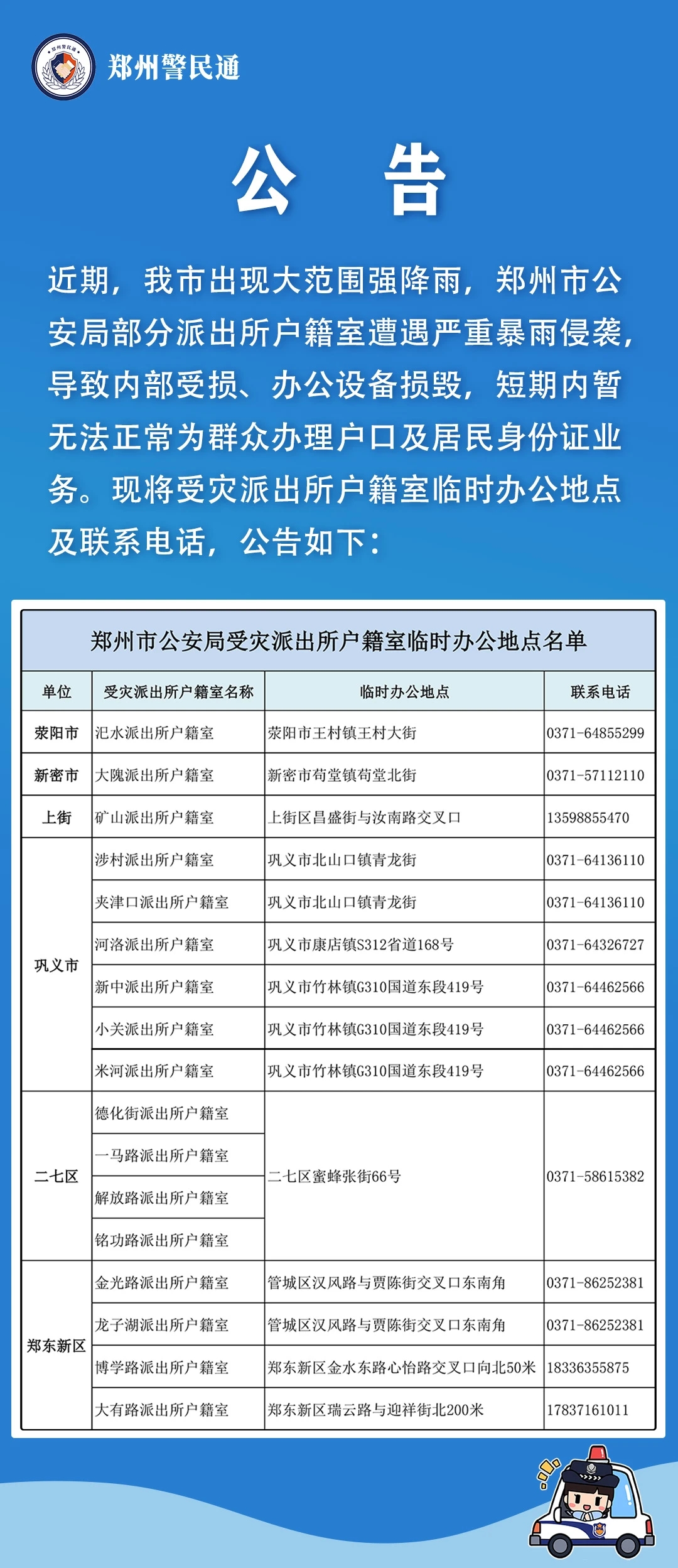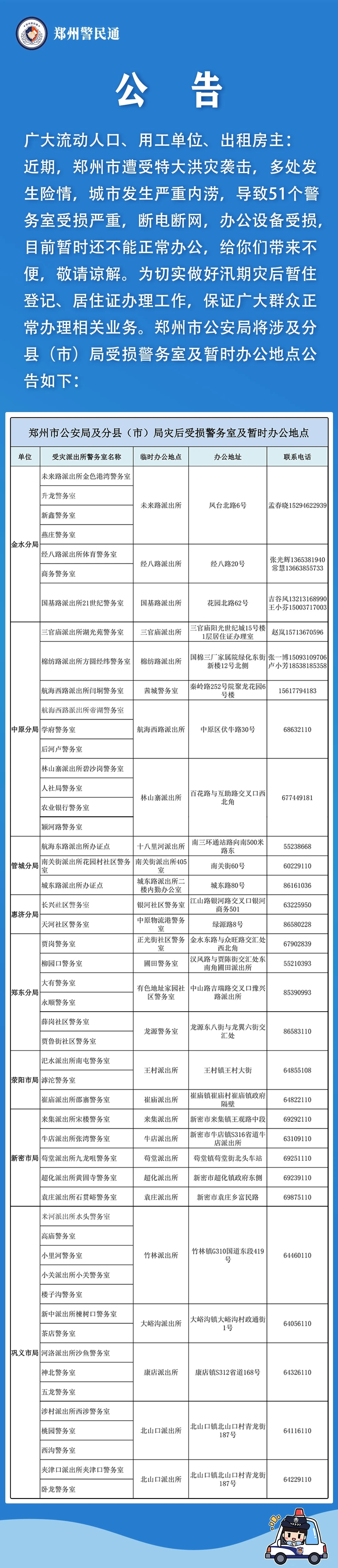 大河网讯 (记者 宋向乐)郑州经过这场暴雨后,通过各方共同的努力,大家的生活在逐步恢复中。7月29日,大河网记者从郑州市公安局获悉,为了方便周边群众办理户籍业务及暂住登记、居住证业务,郑州市公安局特别设置了灾后受损派出所户籍室、警务室的暂时办公地点。有需要的市民可以去这些地方办理相关业务。