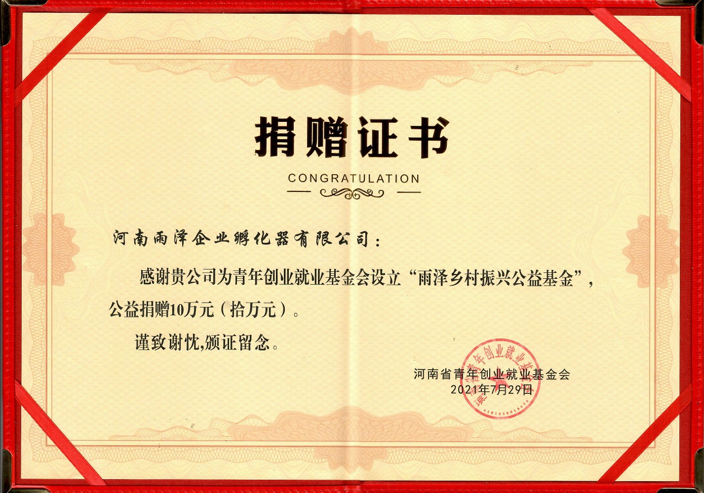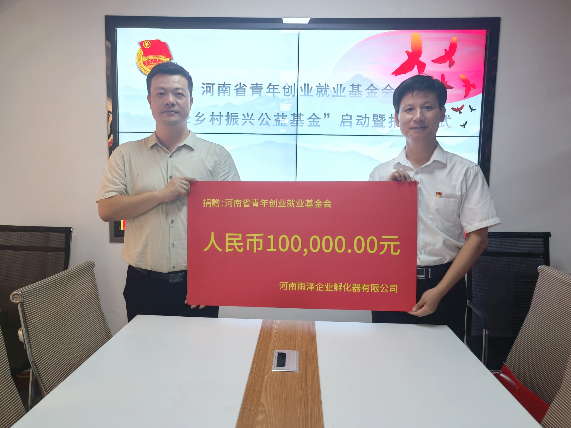 “我们可以提供资金,也可以提供技术指导,帮助想创业的农民,为河南的乡村振兴贡献自己的力量。”吴文新经与河南省青年创业就业基金会沟通,成立了“雨泽乡村振兴公益基金”,河南雨泽企业孵化器有限公司带头捐款10万元。