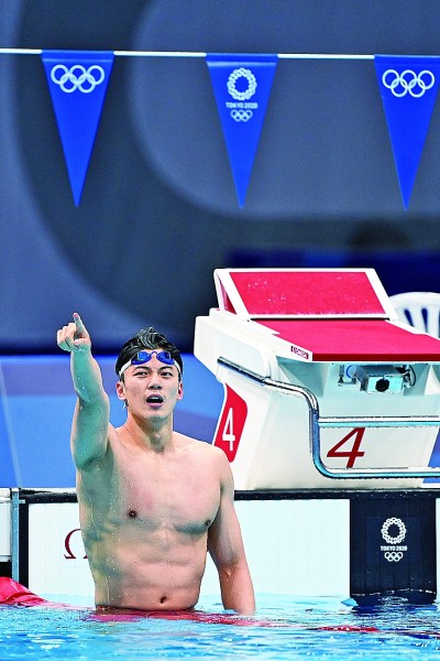 7月30日,在东京奥运会游泳男子200米个人混合泳决赛中,中国选手汪顺夺冠。图为汪顺在夺冠后庆祝。新华社发