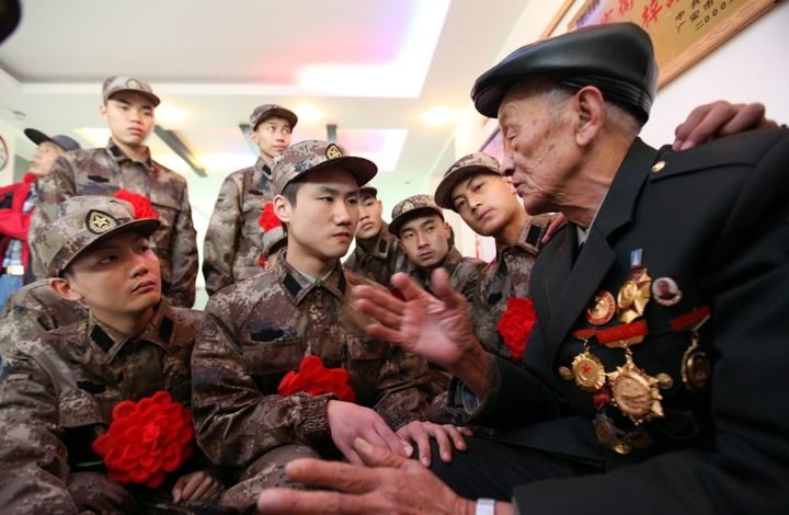 柴云振给来家中探望、即将启程奔赴军营的新兵们讲述战斗故事(资料照片)。新华社发