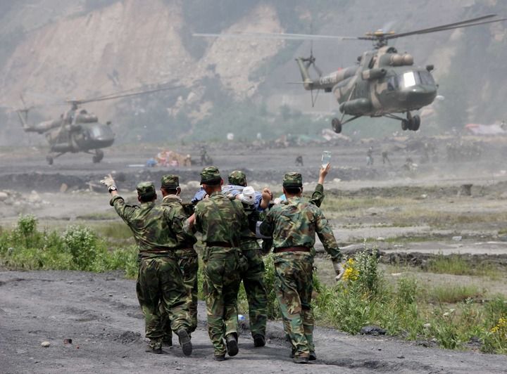 解放军某部派出多批直升机来到地震重灾区汶川县映秀镇,及时抢运伤员(2008年5月16日摄)。新华社记者 查春明 摄