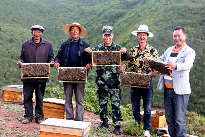 武警四川总队凉山支队精准帮扶昭觉县梭梭拉打村发展养蜂产业,总队驻村扶贫干部布哈(中)和村民一同展示丰收成果(2019年6月12日摄)。新华社发(杨剑摄)