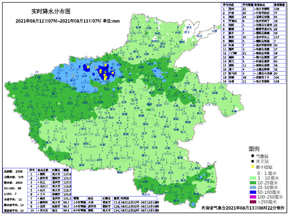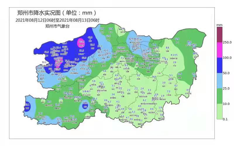 据气象台统计数据显示,8月12日6时至13日6时,郑州市出现雨量分布不均的阵雨、雷阵雨天气,巩义、荥阳局地出现大暴雨。最大降水量出现在巩义市的紫荆137.8毫米。降水量在100-249.9毫米的站点有4个,50-99.9毫米的站点有24个,25-49.9毫米的站点有33个,10-24.9毫米的站点有42个。