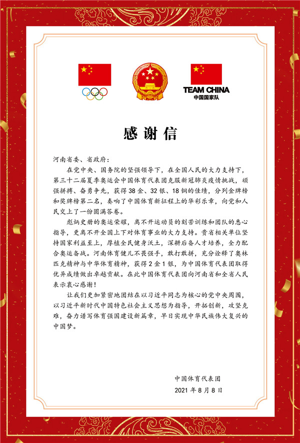 彪炳史册的奥运荣耀,离不开运动员的刻苦训练和团队的悉心指导,更离不开全国上下对体育事业的大力支持。贵省相关单位坚持国家利益至上,厚植全民健身沃土,深耕后备人才培养,全力配合奥运备战。河南体育健儿不畏强手,敢打敢拼,充分诠释了奥林匹克精神与中华体育精神,获得2金1银,为中国体育代表团取得优异成绩做出卓越贡献。在此中国体育代表团向河南省和全省人民表示衷心感谢!