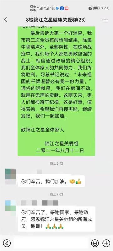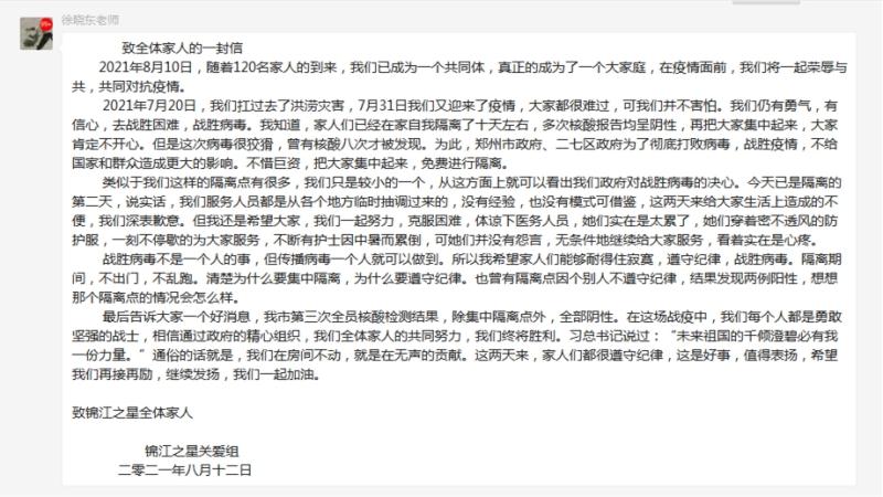 “2021年8月10日,随着120名家人的到来,我们已成为一个共同体,真正地成为一个大家庭,在疫情面前,我们将荣辱与共,共同对抗疫情。2021年7月20日,我们扛过去了洪涝灾害,7月31日,我们又遭遇了疫情,大家都很难过,可我们并不害怕。我们仍有勇气、有信心去战胜困难、战胜病毒。我知道,家人们已经在家自我隔离了十天左右,多次核酸报告均呈阴性,再把大家集中起来,大家肯定不开心。但是这次病毒很狡猾,曾有核酸八次才被发现……我希望家人们能够耐得住寂寞,遵守纪律,战胜病毒。隔离期间,不出门,不乱跑。清楚为什么要集中隔离,为什么要遵守纪律……在这场战疫中,我们每个人都是勇敢坚强的战士,相信通过政府的精心组织,我们全体家人的共同努力,我们终将胜利……”