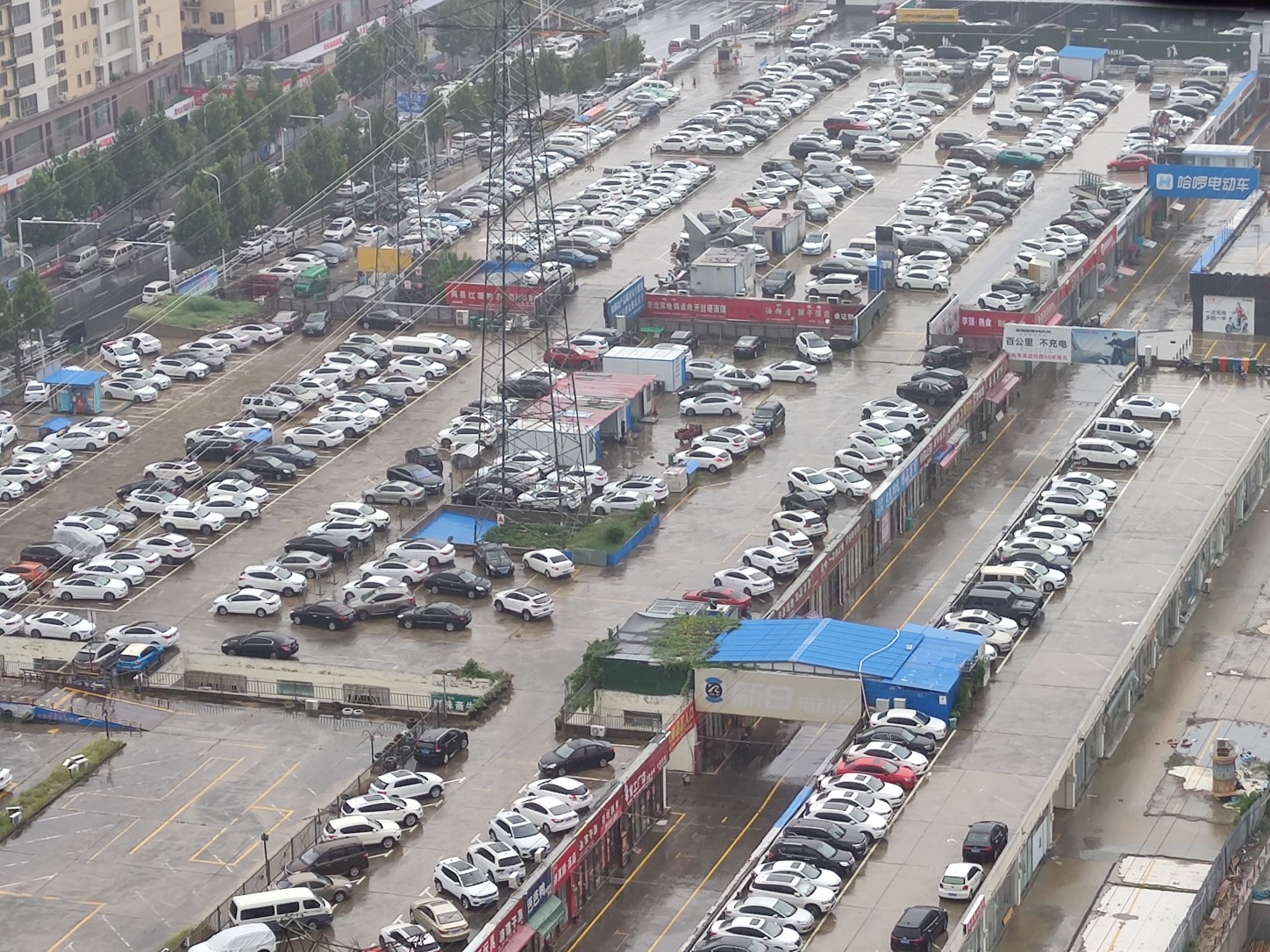 附近的万客来市场二楼停满了躲雨的私家车,旁边的一个小区里物业人员正在将沙袋布置在地下停车场入口,而在小区门口,门岗处的保安对每一位外出的居民都提醒避免外出。